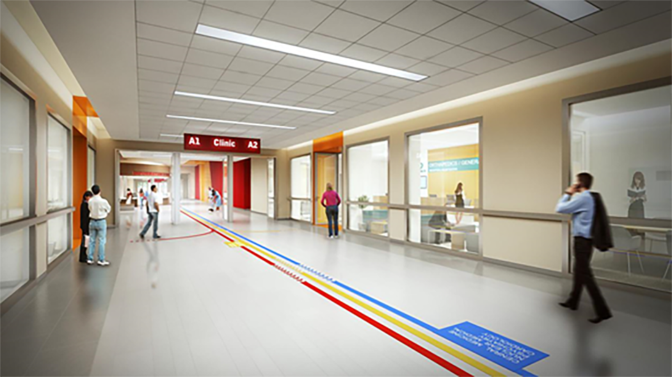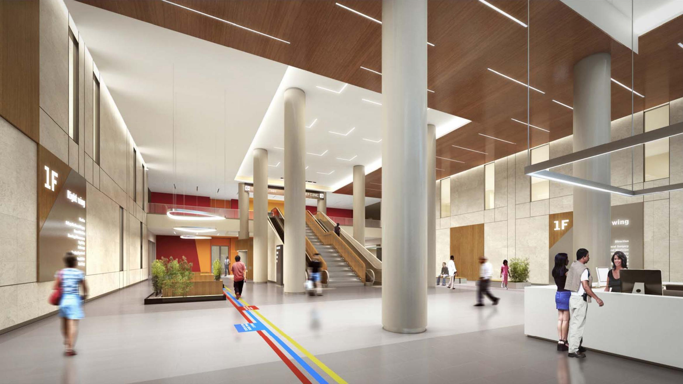 Outpatient flow line: The outpatient hall is located on the south side of the Bodhi tree and is the first stop for outpatient patients to enter the building. It is directly connected to the 8-meter-wide "L" - shaped medical main street located in the middle of the podium, serving as a horizontal transportation channel for patients; There are escalators and open stairs connecting the first and second floors in the lobby, and a vertical elevator is installed nearby.