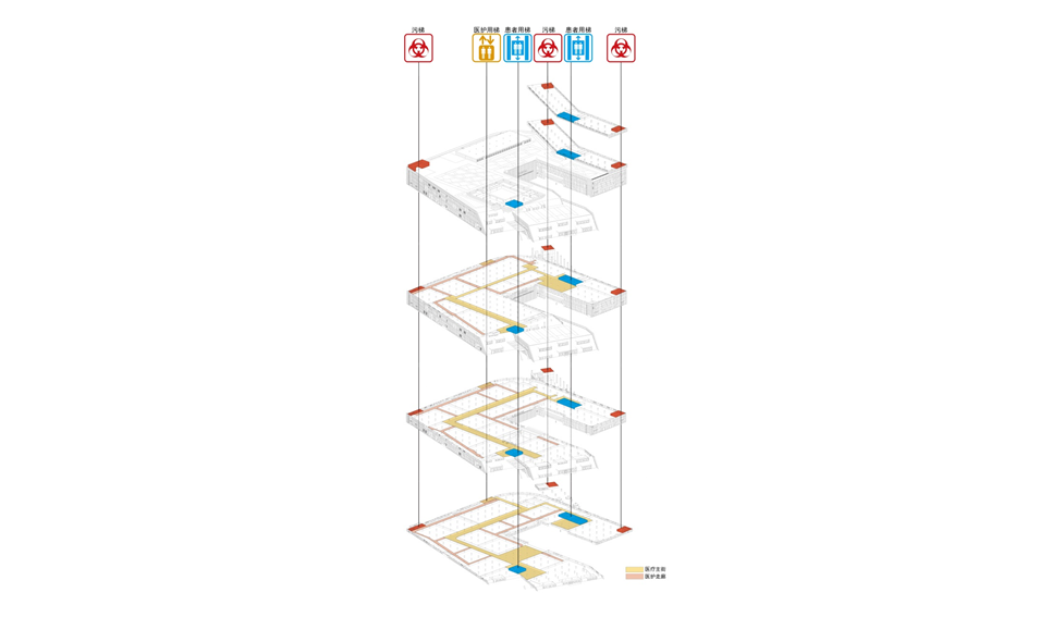 ●洁污分流:为了避免交叉感染情况的发生,建筑内严格区分洁污流线。首先是竖向分梯,裙房和病房楼分别设有专用污梯;其次是在手术部、ICU、生殖中心、消毒供应室等部门严格按照洁污分流进行科室内部流程设计,设有污物专用通道,污物在科室内部打包处理后用专用污车通过污梯运至院区内指定地点进行焚烧处理。