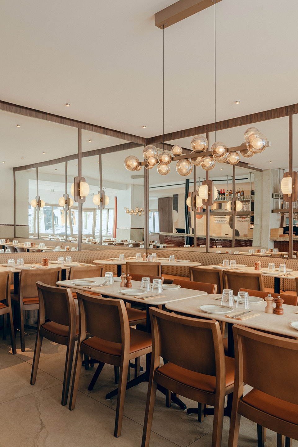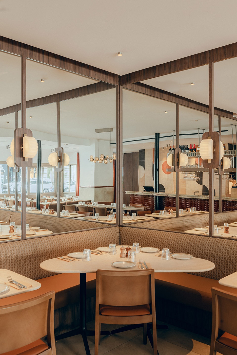 A Mediterranean restaurant known for its hearty cuisine, Cook needed to reflect that warmth in its atmosphere. With their crreativity and signature, Mersi managed to add this sense of conviviality into every detail. “We wanted a style that was simple and distinctive,” explains Meryl. “We played with shapes, materials, and warm tones. The lighting, carefully designed, brings different moods throughout the day. The bar, inspired by traditional Parisian bistros, interacts with a jute canvas wall mural and mirrored accents that expand the space.”