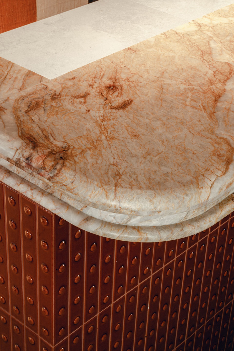 延续其一贯的建筑方法,MERSI事务所为餐厅定制了一系列元素,塑造出独一无二的身份识别:吧台台面、悬挂式酒瓶陈列架、采用Elitis与JAB面料包覆的精美长椅、与Aromas del Campo壁灯相呼应的镜框、定制餐具推车与桌面设计。来自Elitis的全景式墙面覆盖,暖色调中带有些许复古气息,增添了优雅感并营造出温馨氛围。而最后的意外惊喜来自洗手间——刻意的俏皮设计以大胆鲜艳的色彩带来趣味性的片刻放松。