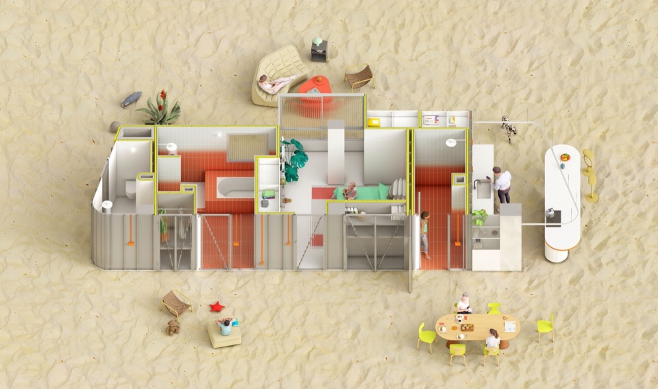 Módulo Hábitat 以一个紧凑的核心形态展现,集中所有基本服务:厨房、浴室、储物空间、设施和气候控制。受到模块化空间设计的启发,这种方法腾出了可用地面面积,允许更灵活和流动的内部布局。