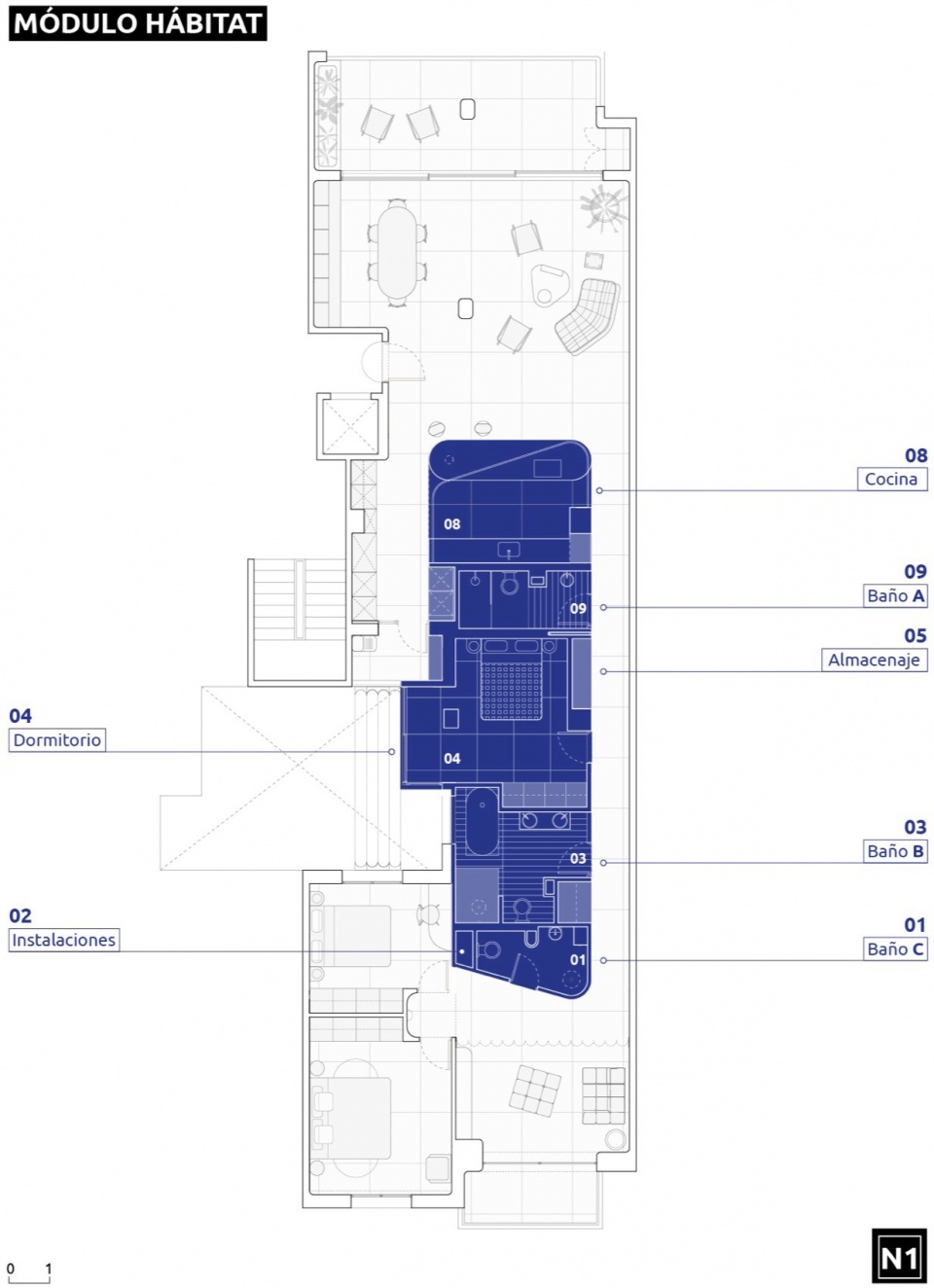 Módulo Hábitat takes shape as a compact core that concentrates all essential services: kitchen, bathrooms, storage, installations, and climate control. Inspired by modular space design, this approach frees up usable floor area and allows for a more flexible and fluid interior layout.