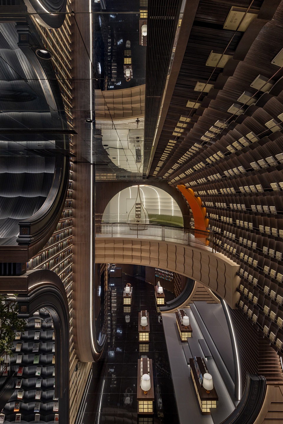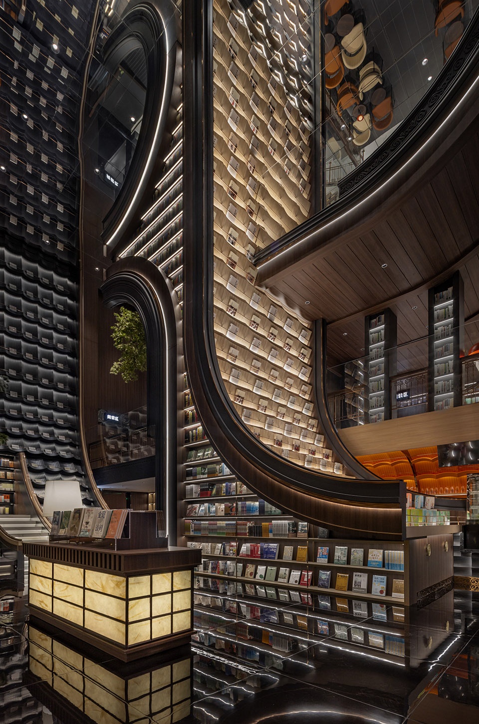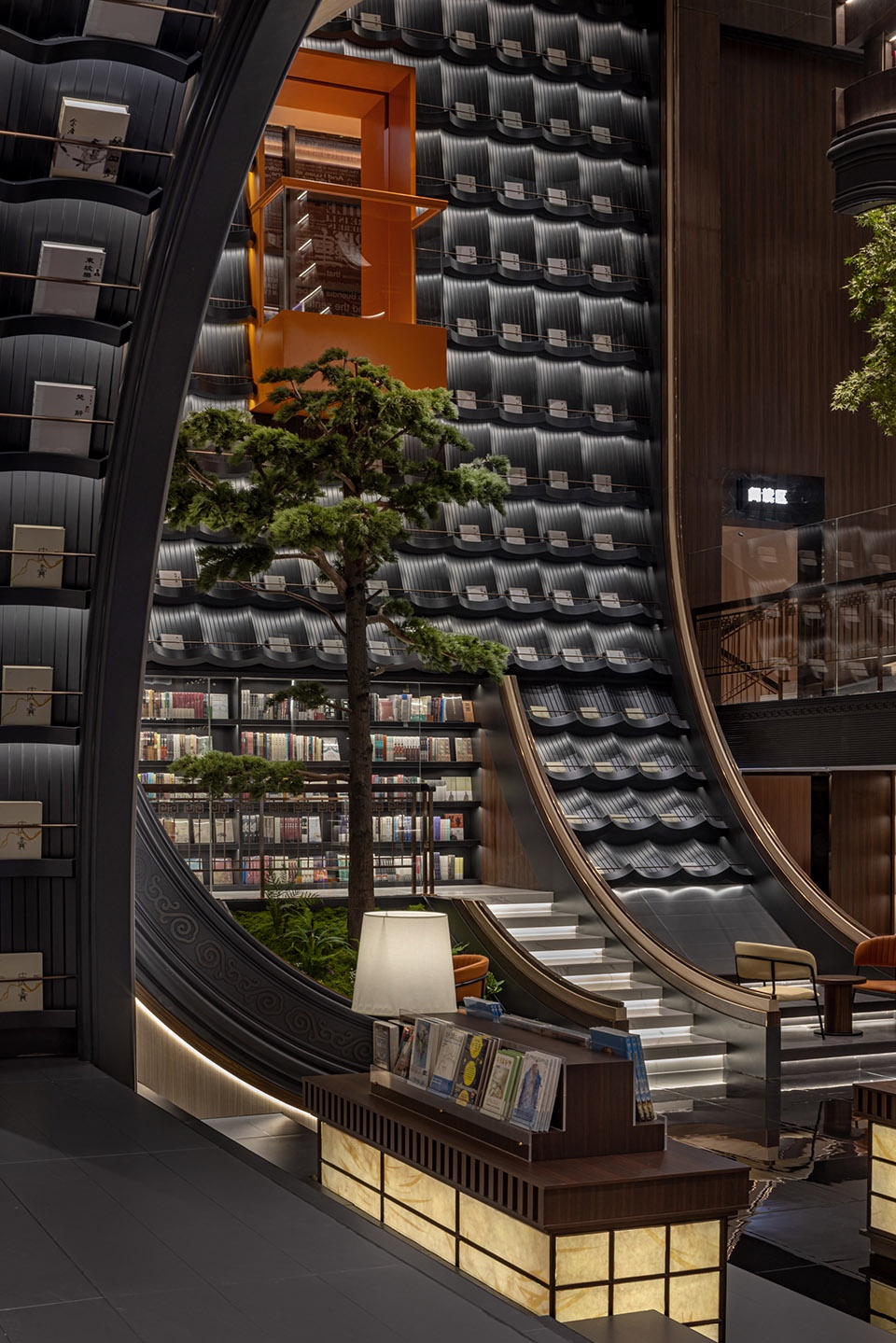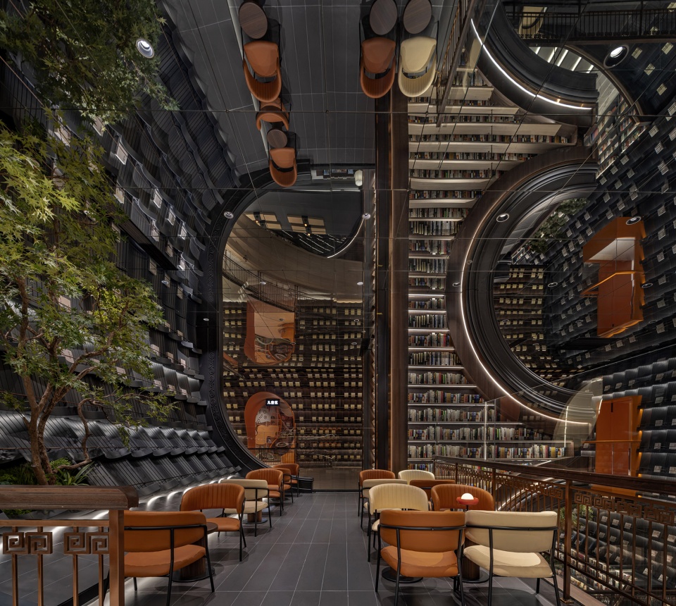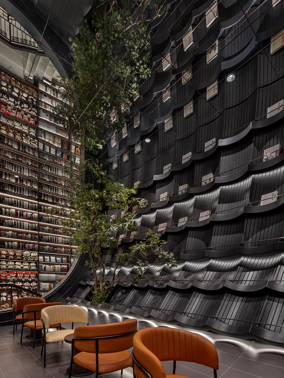 立体的屋檐,高耸的书架,悬挂于屋顶的几何灰色瓦片阵列,共同交织成“屋舍叠院”般的聚落感,既多维立体又遥相呼应,设计师采取“去装饰化”的提炼,实则是将宋元木构的匠心转化为现代空间语法,体现“在历史中栖居”的生活姿态。