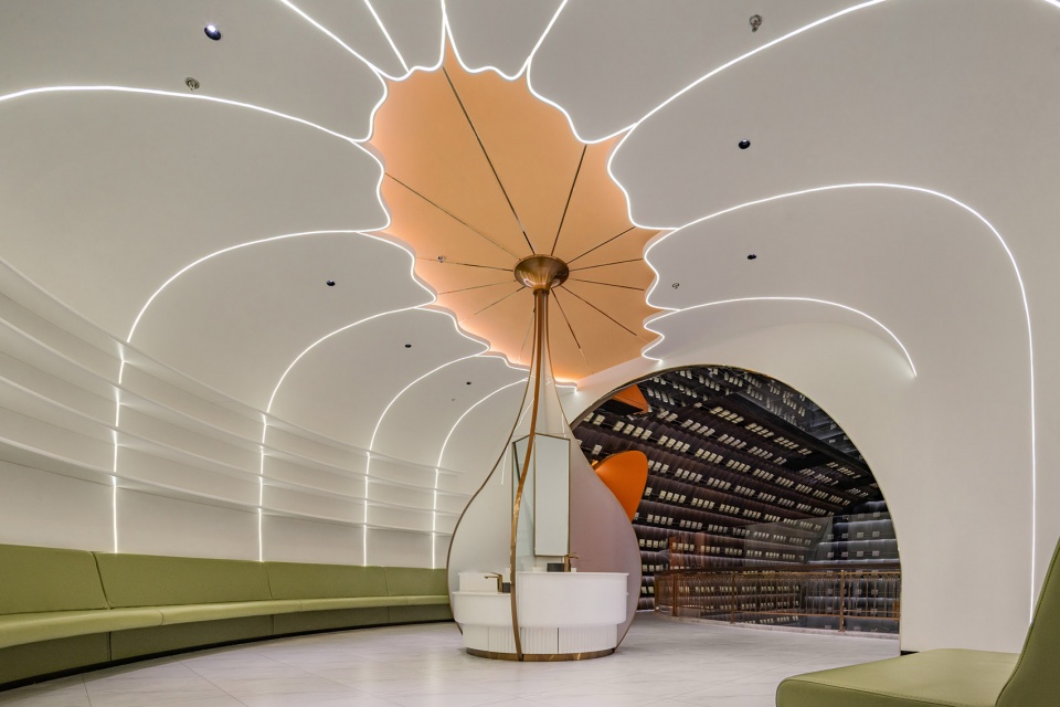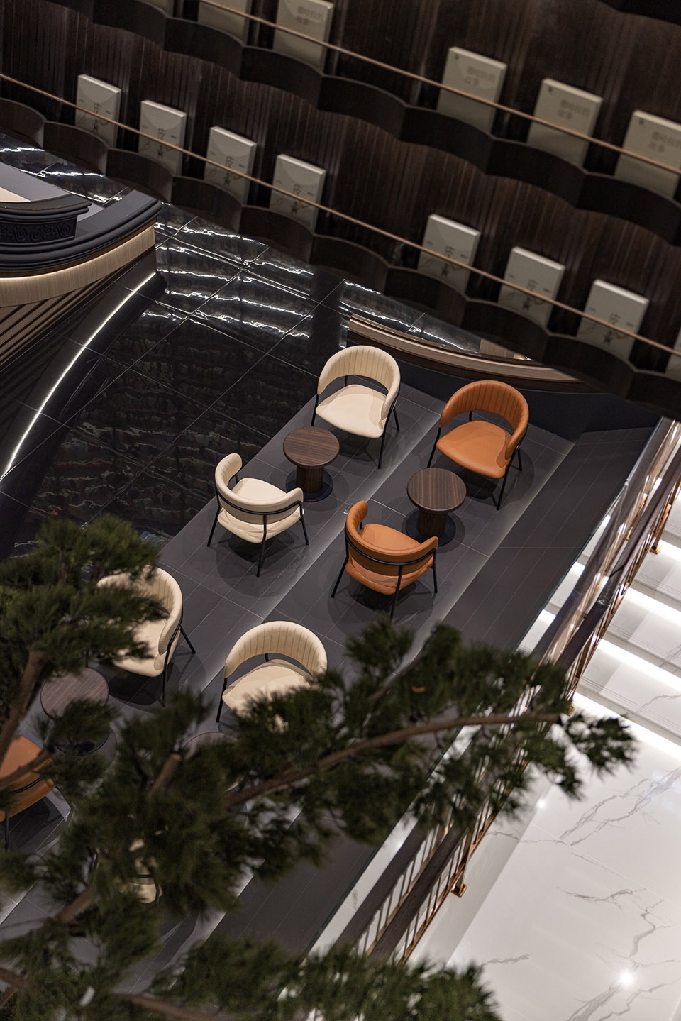Articulated eaves, towering shelves, and suspended arrays of grey tile-inspired elements intertwine to evoke the sense of an interlocking architectural cluster—multi-dimensional and spatially interactive, where forms echo one another across space. By refining away excess ornament, the designer translates the craftsmanship of Song and Yuan timber frames into a modern spatial syntax, embodying a way of life that “dwells within history.”