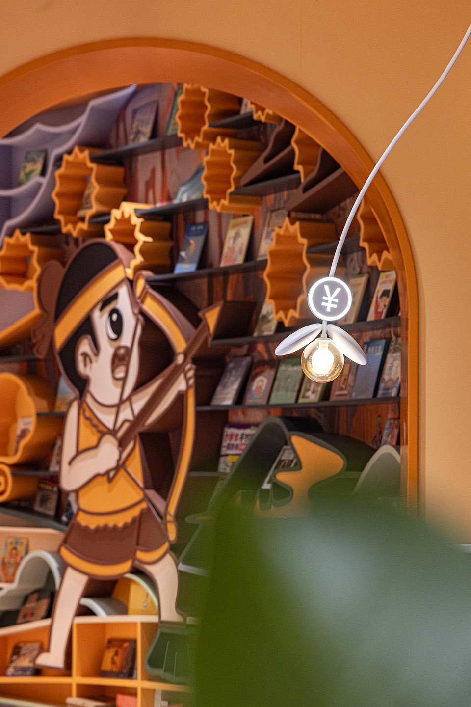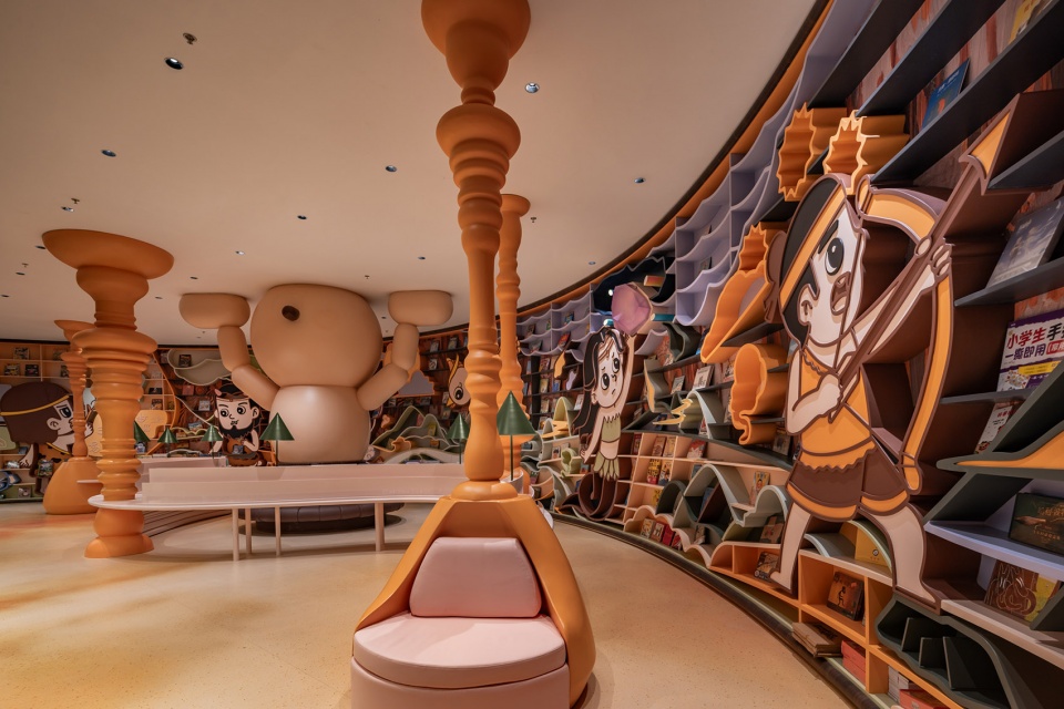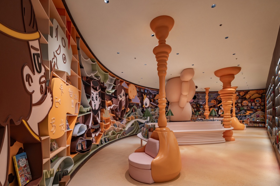 钟书阁儿童区将“混沌初开”的宇宙观进行物理化的呈现。女娲补天遗落的五彩石浆,挥洒出彩云般轻盈的书台,精卫填海掀起的碧波荡漾,成为涡旋托起绘本的方舟。整个空间设计以大地色系为基底,搭配朱红、靛蓝、藤黄等传统矿物颜料色彩,让神话故事转化成可感知的教育场域。