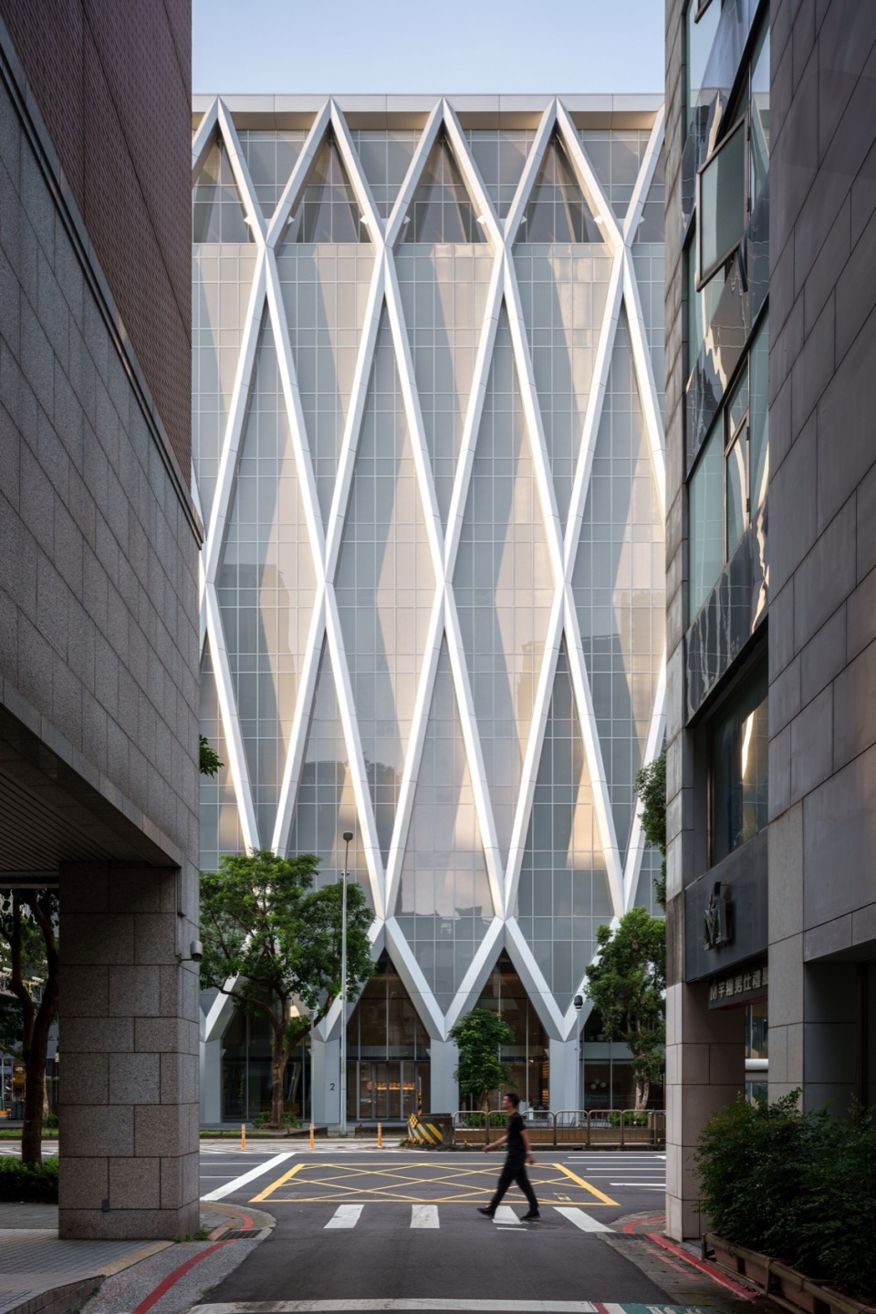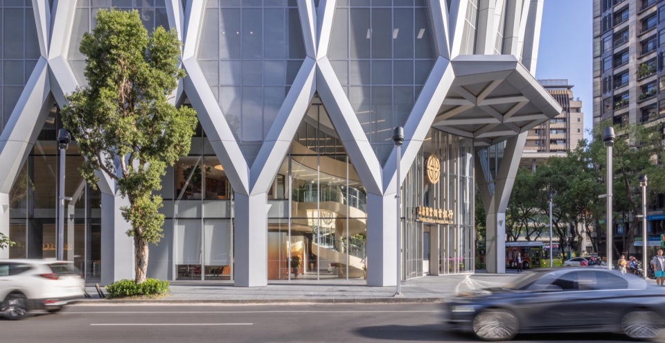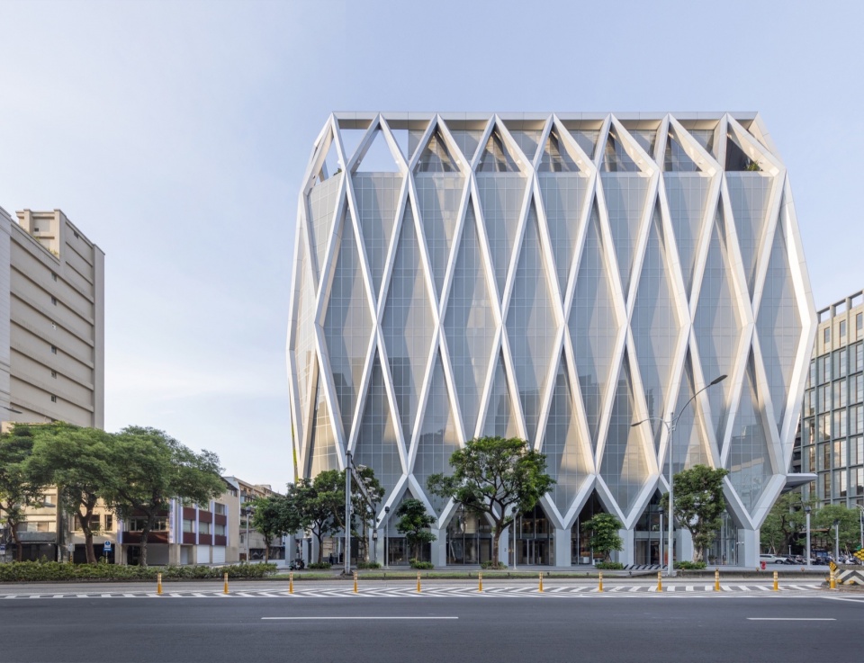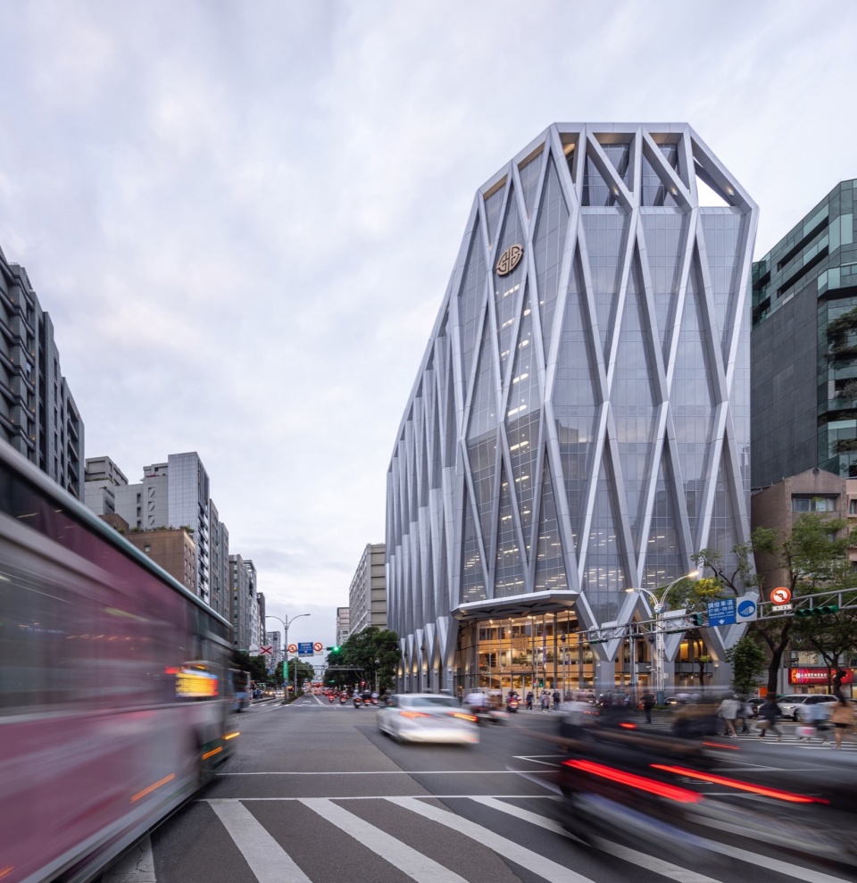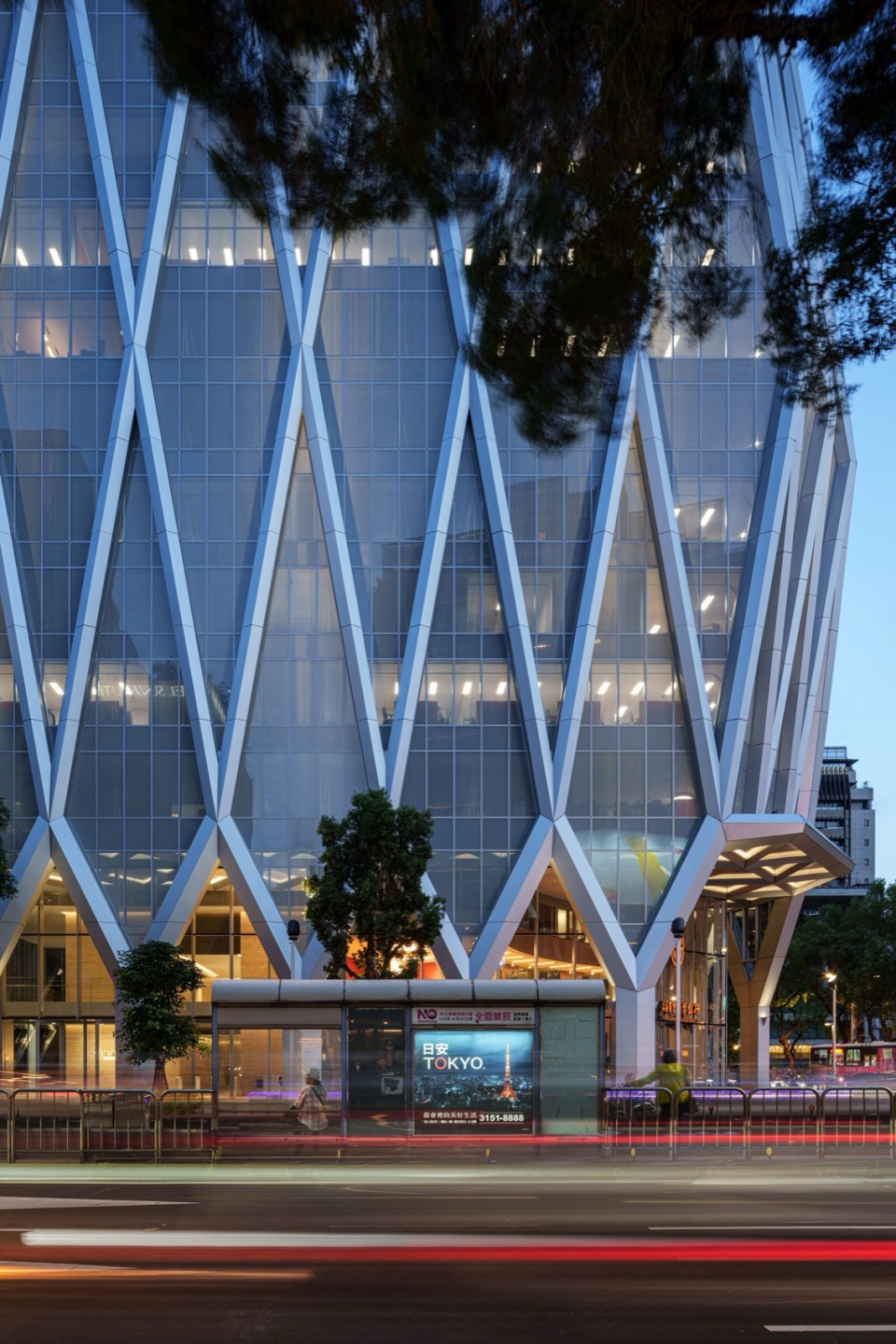 ▼从民权东路看建筑外观上简洁的钻石型几何语汇,Diamond-Inspired Façade Geometry viewed from Minquan East Road