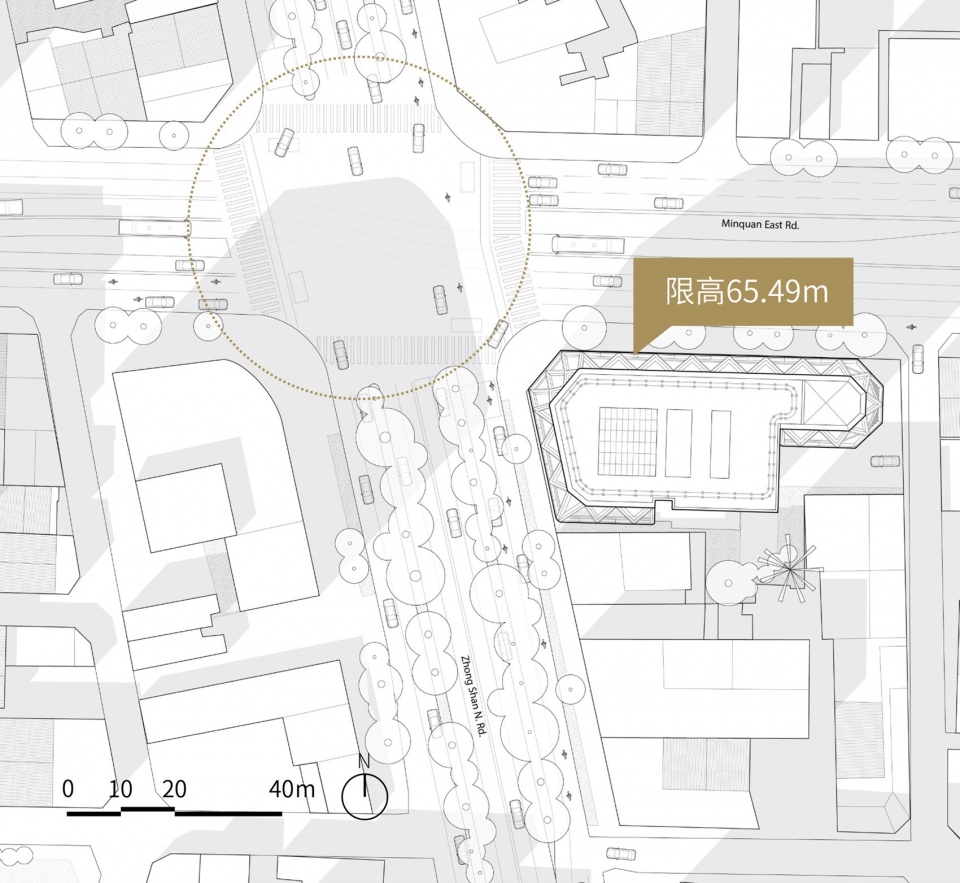本项目要在台北市城市干道民权东路与中山北路交叉口为上海商业储蓄银行重建一栋总部大楼。尽管基地面积有限,且受松山机场航道65.49m建筑限高制约,但其周遭街廓肌理丰富,叠加聚气纳财的「大周天」风水格局,历来为繁华的区域核心商圈——建筑前身即为80年代都市摩登地标「美琪大饭店」。