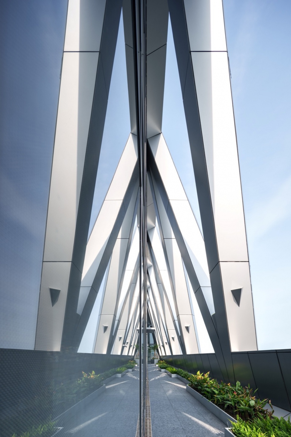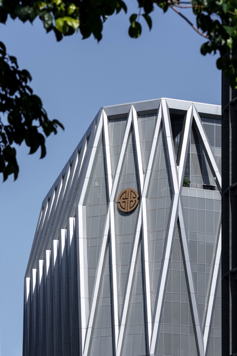 建筑外围的斜肋式结构(DIAGRID)采用「Y」「X」与「倒V」型构造。该系统在优化结构力流路径的同时,可显着减少钢材用量,并提升整体抗风与抗震性能。简约的几何语言形成多个切面,引起对钻石和金融秩序的联想。
