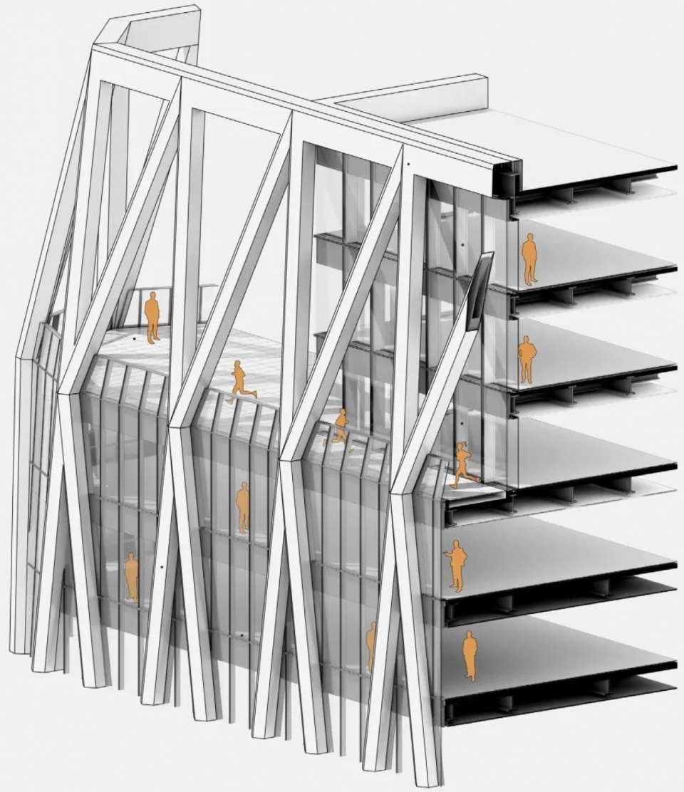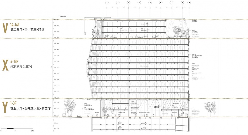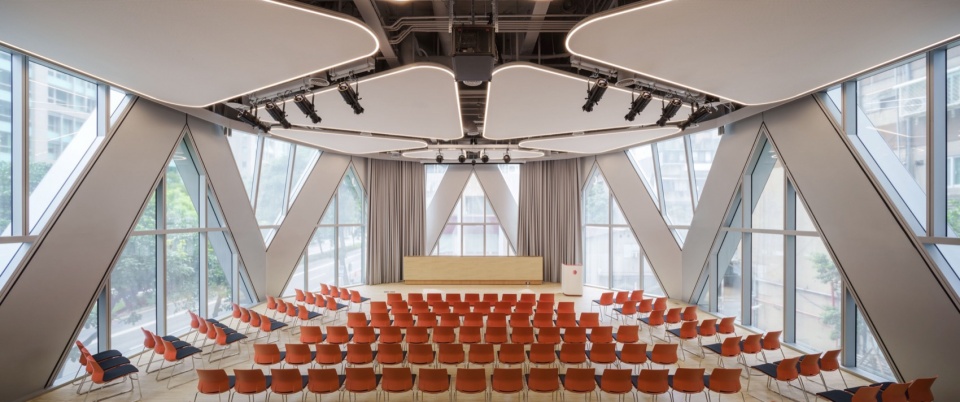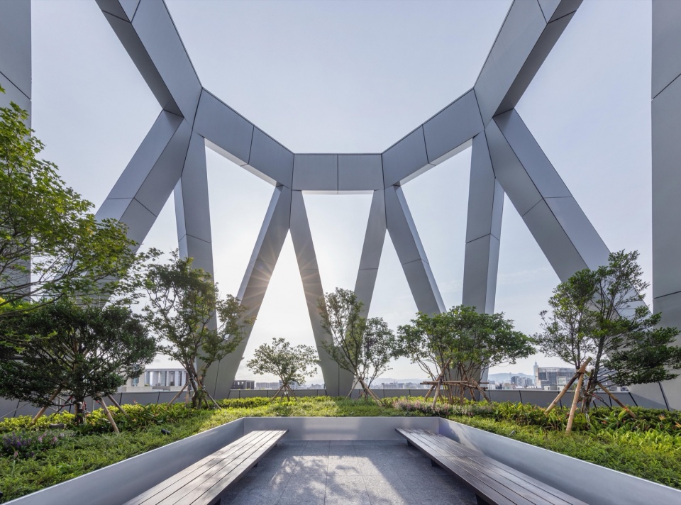 The diagonal rib framework integrates form and function. Floors 14–16 use an inverted “V”structure for open high spaces with city and sky garden views, while floors 4–13 employ an “X” system with an energy-efficient curtain wall, maximizing daylight and interior–exterior continuity.