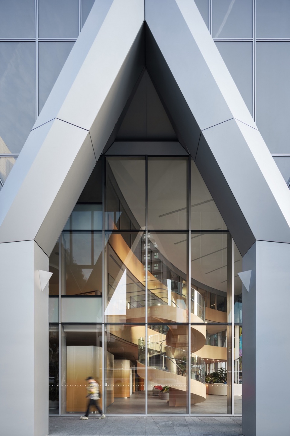 The project employs a “Y”-shaped structure to enclose the three-story-high arcade, using structural support and rhythmic variation to create a more open, fluid public interface, strengthening the interaction between the building and the street.