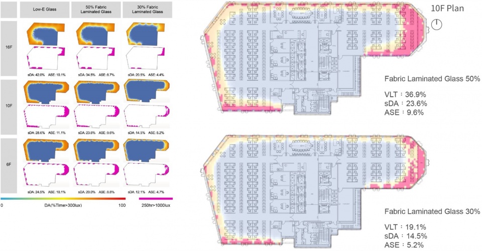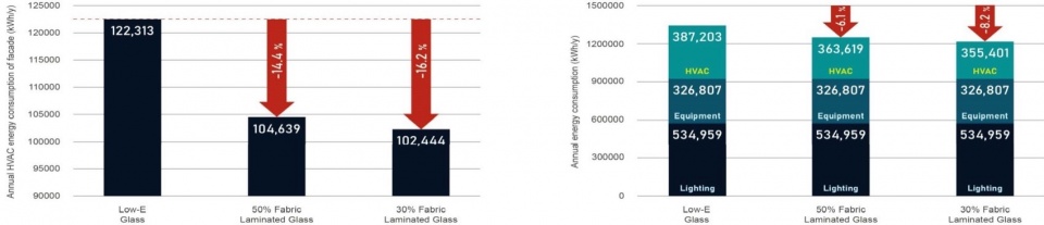 在进一步的建材评估中,设计团队导入由瑞士 SEFAR 公司研发的新型金属网膜玻璃。经模拟分析,相较于一般 Low-E 玻璃,透光率50%和30%的金属网膜玻璃分别可降低空调系统6.1%和8.2%的年耗电量,约减少碳排10~15吨。