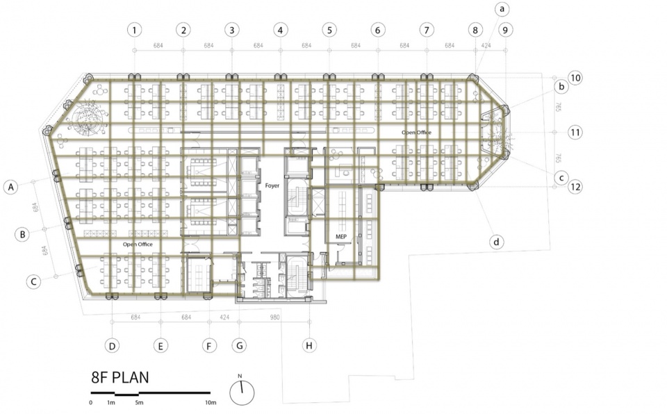 为满足A级办公空间所要求的2.7m净高,结构设计采用无梁板系统:统一压扁梁高并嵌入管线,形成平整的室内天花。本案中,70cm深的格子梁最大跨距达27m,搭配90颗TMD小型阻尼器,有效提升结构劲度、抑制长跨共振。在建筑、结构与机电的多专业协同下,整体系统达成法规1.5倍的抗震性能要求,实现空间弹性与结构安全的双重目标。