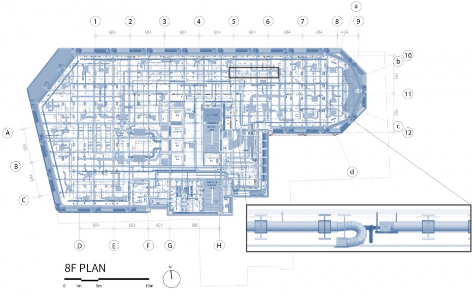 ▼8F格子梁系统和各专业整合平面(放大区域为钢梁穿孔示意),8F Waffle Beam System and Multi-Disciplinary Integration Plan (Enlarged Area Shows Perforated Steel Beams)