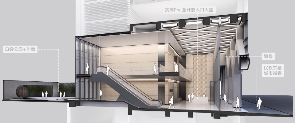 ▼骑楼-全开放入口大堂-口袋公园」序列,Sequence of “Arcade – Fully Open Entrance Lobby – Pocket Park”