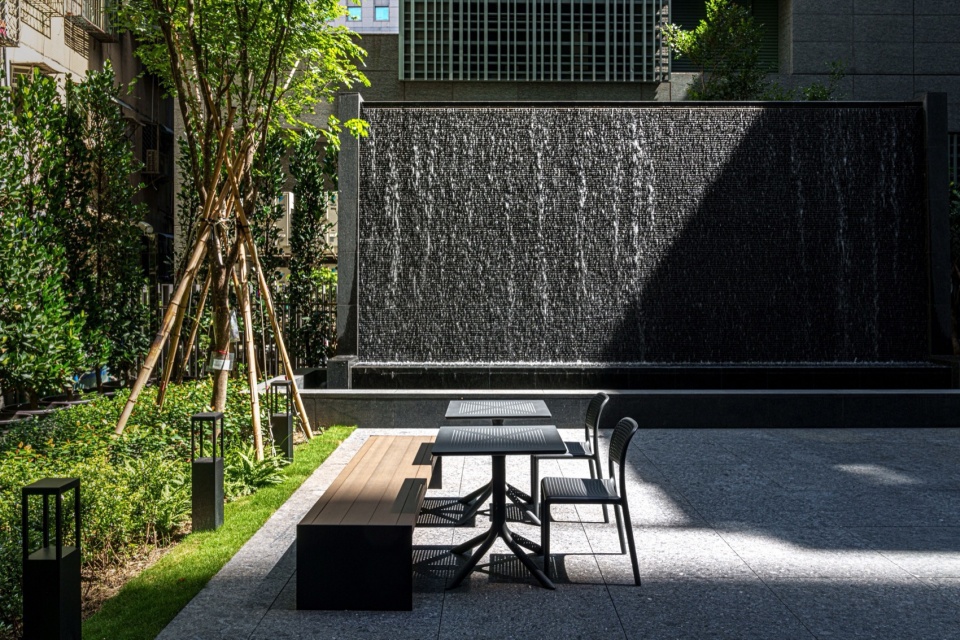 穿过民权东路一侧的全开放大堂,行人可步入基地最深处的微型绿地。该空间借鉴美国城市规划中的「Pocket Park」概念,以流瀑隔绝都市喧嚣,营造静谧宜人的城市绿境。