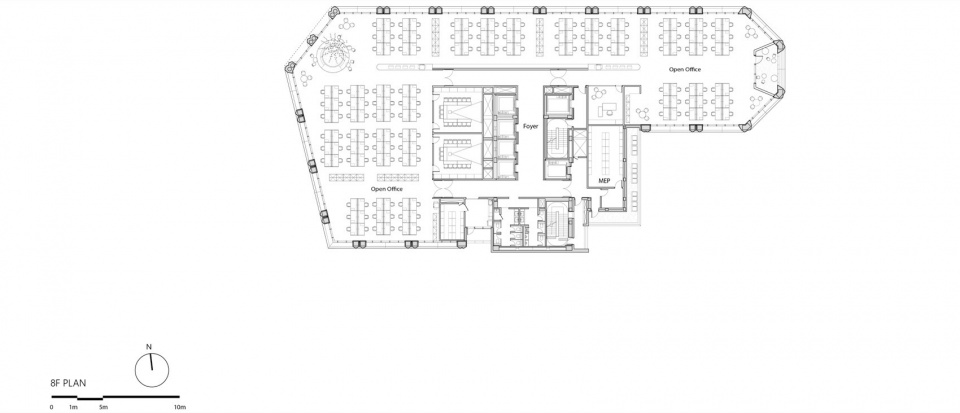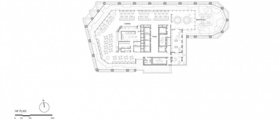 本案中,骑楼(1~3F)内侧无需考虑热负荷,更清透的优白玻璃成为首选;主要办公层(3~13F)借用50%透光网膜玻璃视线单向穿透的特征,兼顾采光和隐私;14F以上则通过30%透光网膜玻璃与卷帘形成双重屏障,应对高空热辐射。这集中体现了后高技派的可持续设计观:建造方案终要符合并表达空间使用特征,并为使用者与环境的协同进化服务。