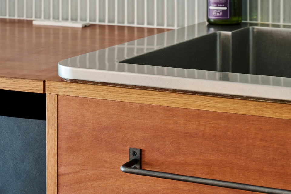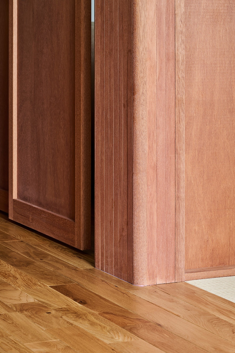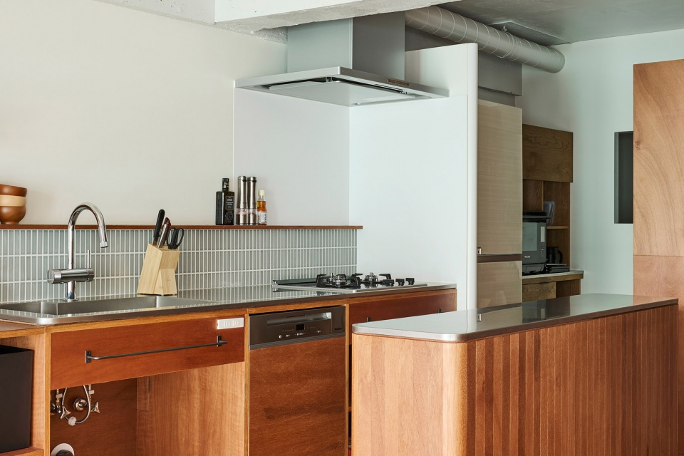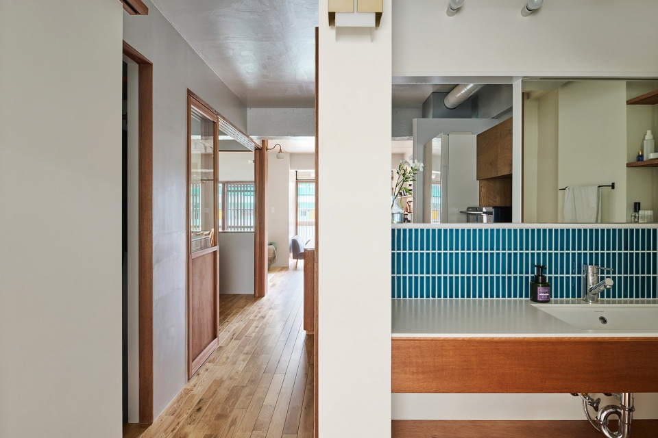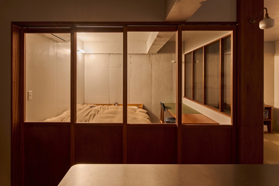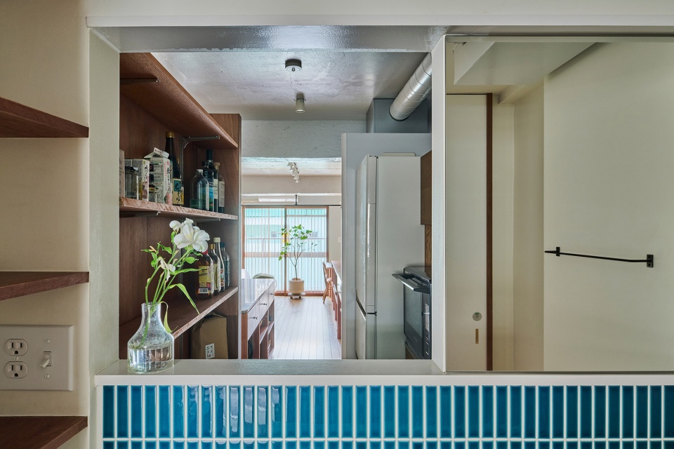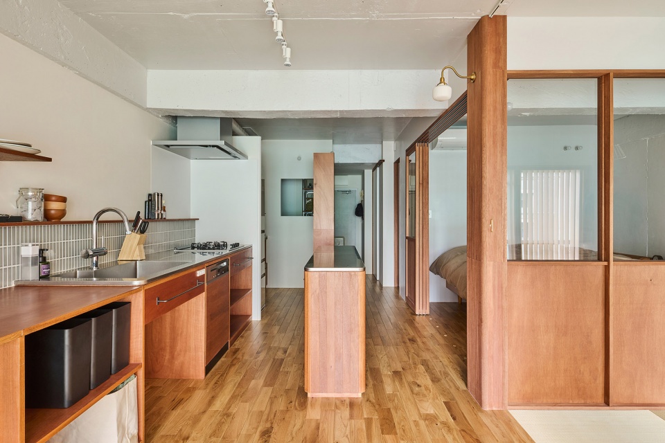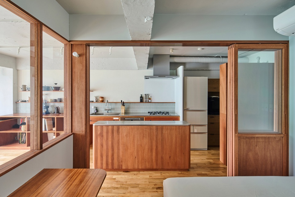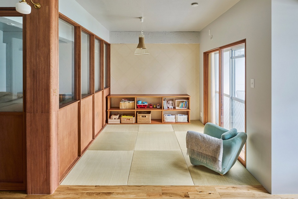 材料的运用强化了光影质感:略带肌理的饰面、和纸墙面、厨房的瓷砖,以及以柿渋(一种日本传统天然涂料)处理的椴木胶合板,共同营造出温润而富有层次的空间氛围。
