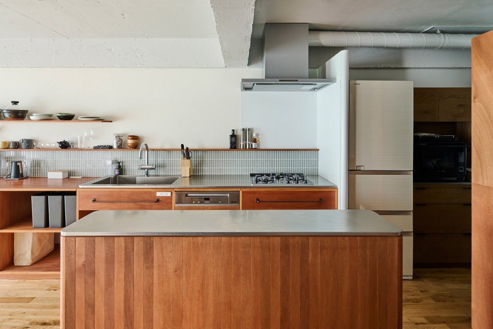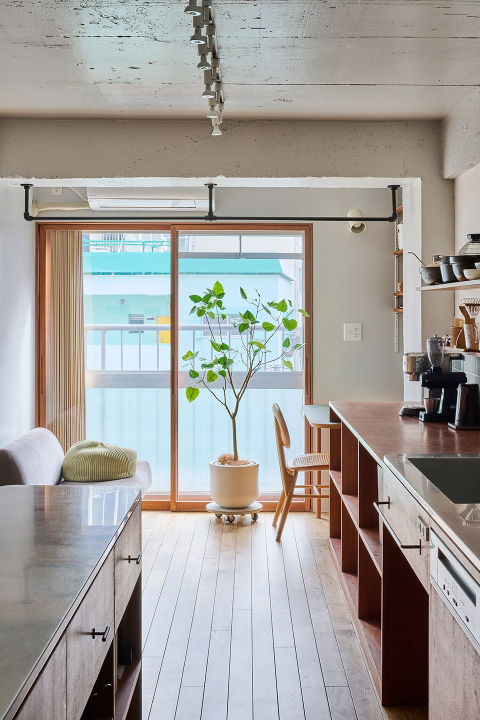 This is a renovation project in east Tokyo. The client wished for an open lifestyle where they could feel the presence of a family, in a compact living environment where they could get in touch with nature such as wind and sunlight.