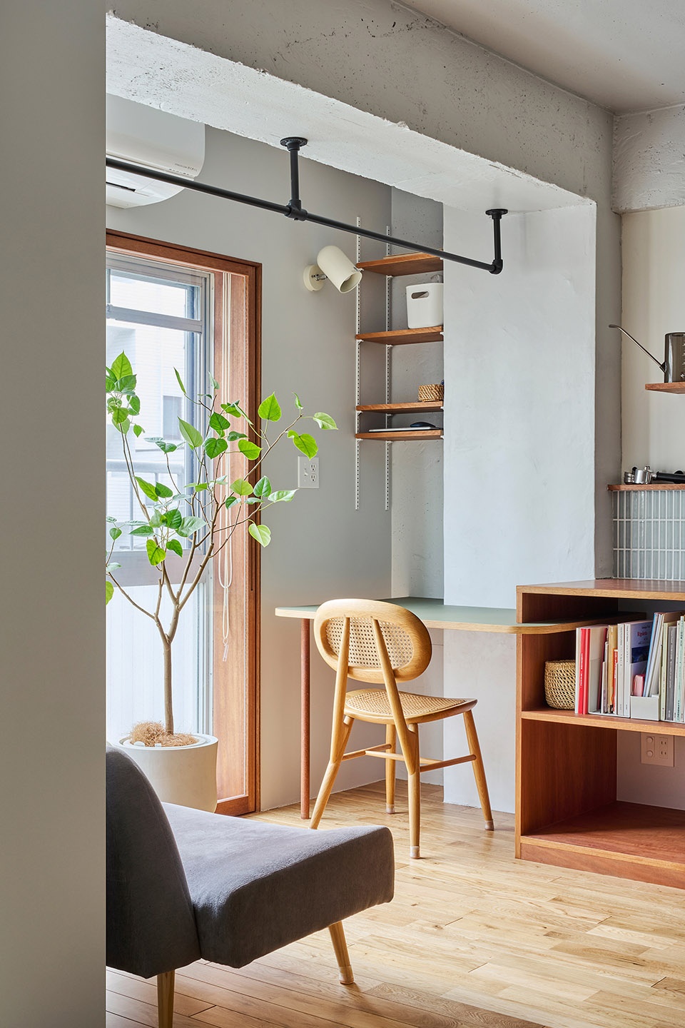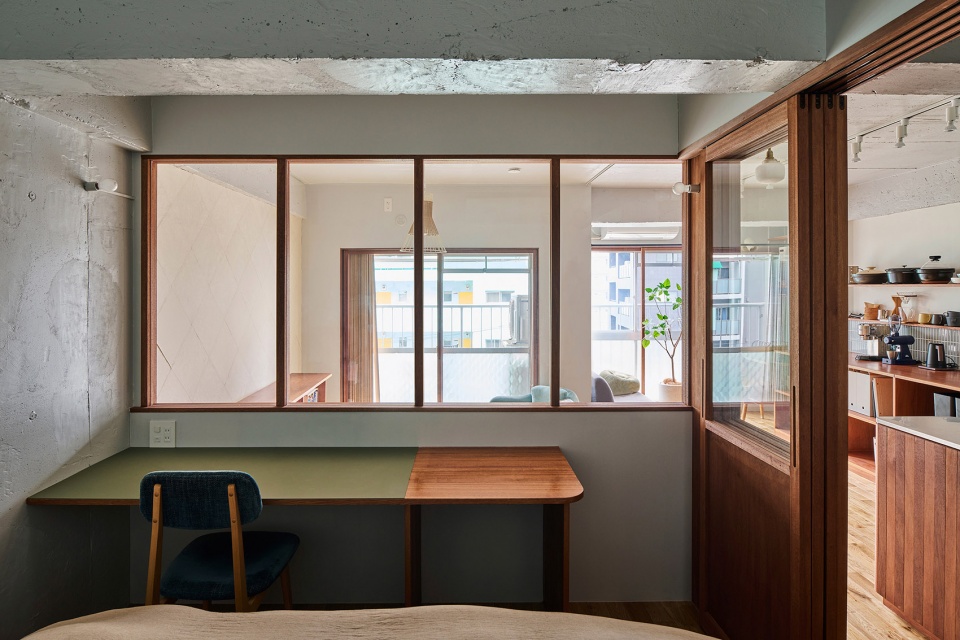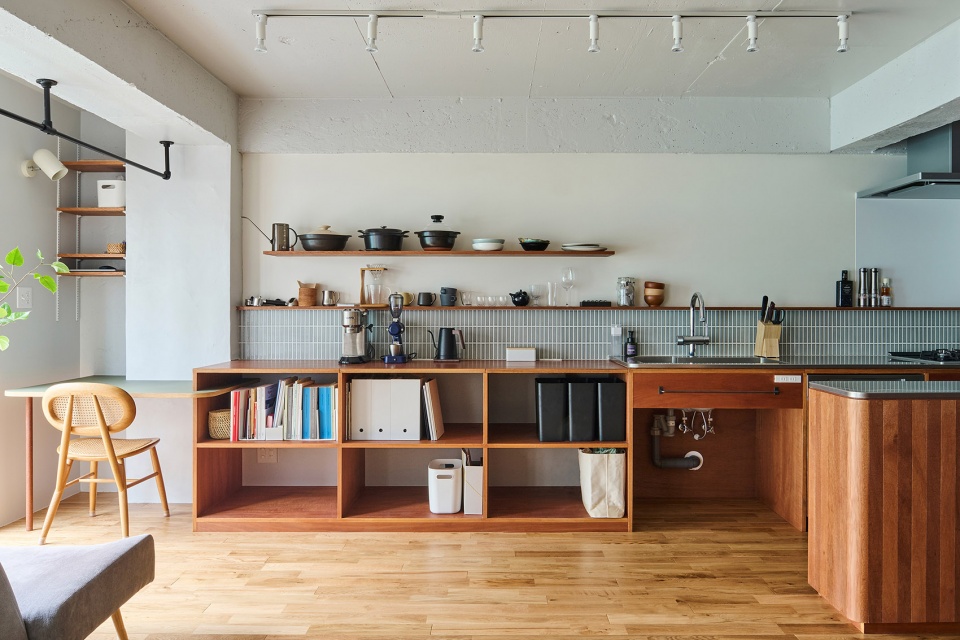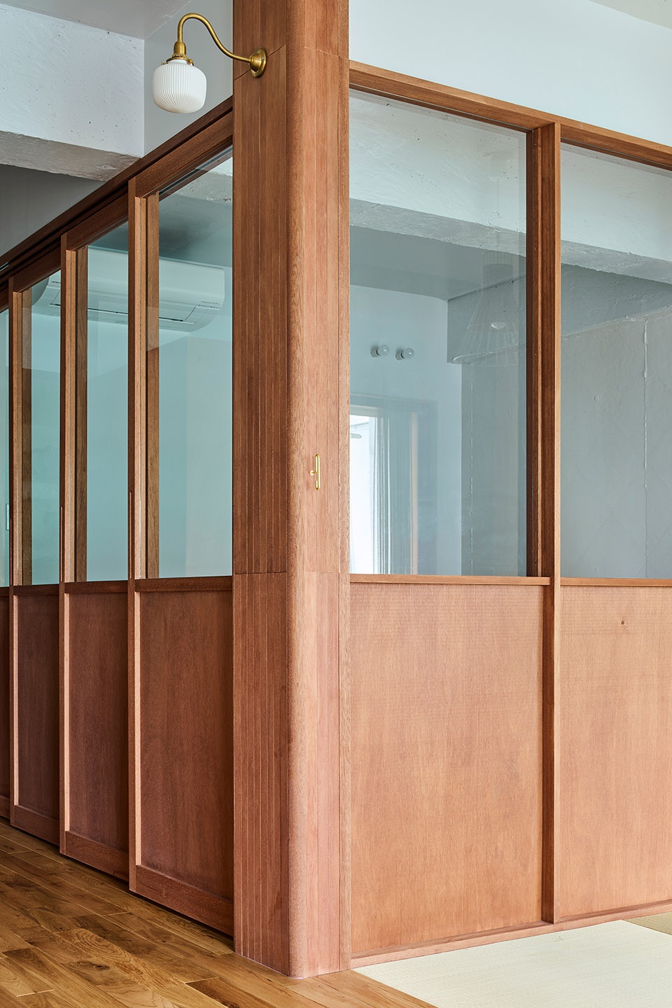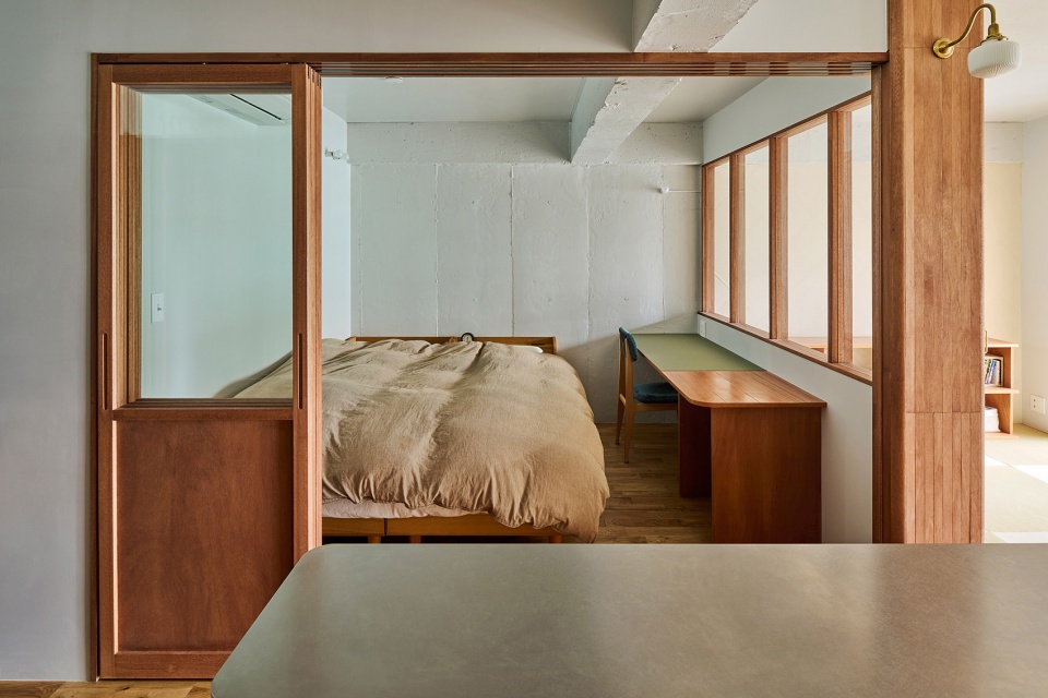 在规划过程中,尽管住宅面积有限,我们仍提出以“开放”为核心的居住理念:让居住者在小尺度的空间中亲近自然、感受光风,并始终保持家人之间的交流与连结。原有住宅为典型的老式日式平面,起居室和卧室几乎没有窗户,室内昏暗潮湿,通风不良。我们在延续既有格局的基础上,以中央柱体和半透明的界面(如玻璃门、地面材质的变化等)进行空间划分,创造出通透舒适的环境。沿墙设置的长台面,将视线自然引向室外。台面与设施的高度设计结合光影的层次,使日常活动与光线的渐变相呼应。面向阳光充足的阳台一侧,被设计为类似“缘侧”的空间,成为可以静坐休憩的场所。