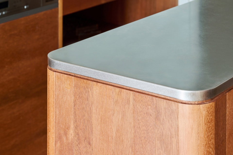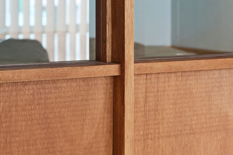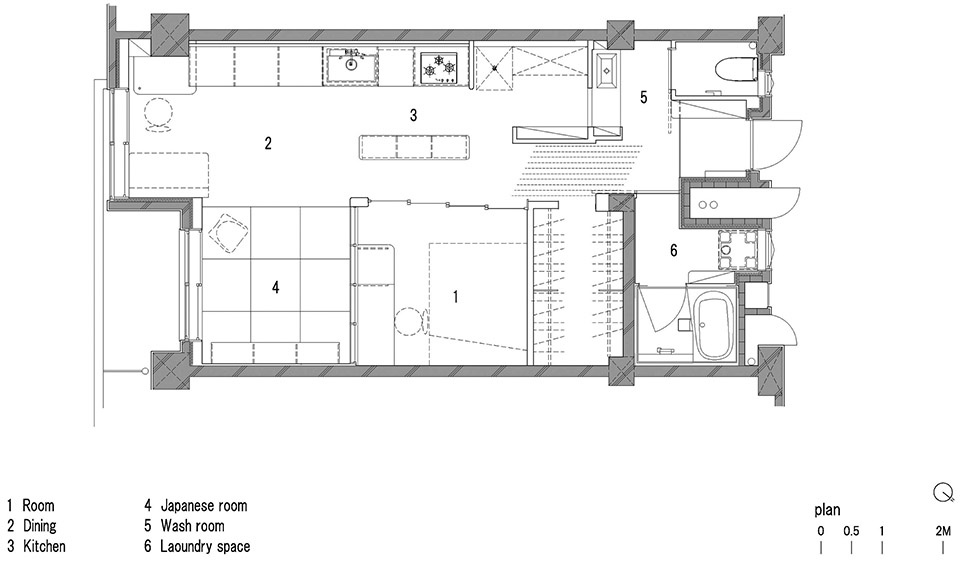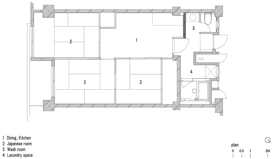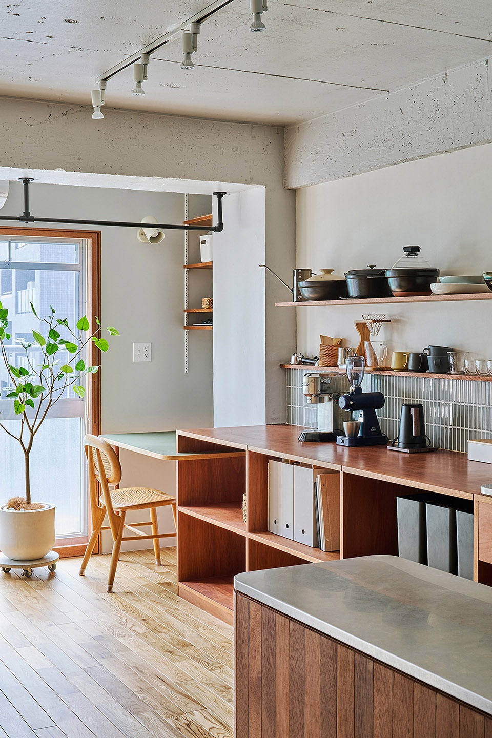在规划过程中,尽管住宅面积有限,我们仍提出以“开放”为核心的居住理念:让居住者在小尺度的空间中亲近自然、感受光风,并始终保持家人之间的交流与连结。原有住宅为典型的老式日式平面,起居室和卧室几乎没有窗户,室内昏暗潮湿,通风不良。我们在延续既有格局的基础上,以中央柱体和半透明的界面(如玻璃门、地面材质的变化等)进行空间划分,创造出通透舒适的环境。沿墙设置的长台面,将视线自然引向室外。台面与设施的高度设计结合光影的层次,使日常活动与光线的渐变相呼应。面向阳光充足的阳台一侧,被设计为类似“缘侧”的空间,成为可以静坐休憩的场所。
