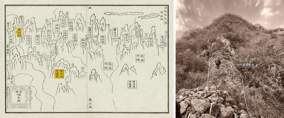 ▼《四镇三关志》(1574年)中的黄花城和西水峪与西水峪山野中的隘墙遗迹,From Records of Four Towns and Three Passes (1574), featuring Huanghuacheng and Xishuiyu & The remnants of the barrier wall in the wilderness of Xishuiyu