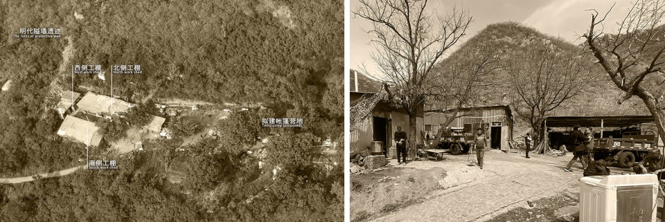 ▼2019年基地工棚布局及拟建帐篷营地位置&2019年基地内的基建队工棚,Layout of the sheds on the 2019 base and the planned location for the tented campsite & The construction team’s sheds at the site in 2019