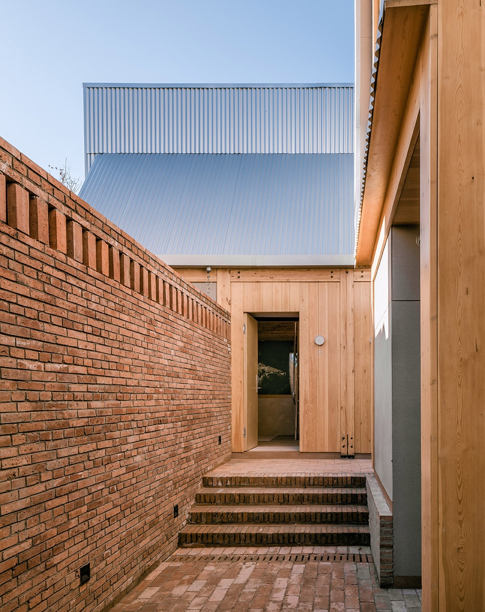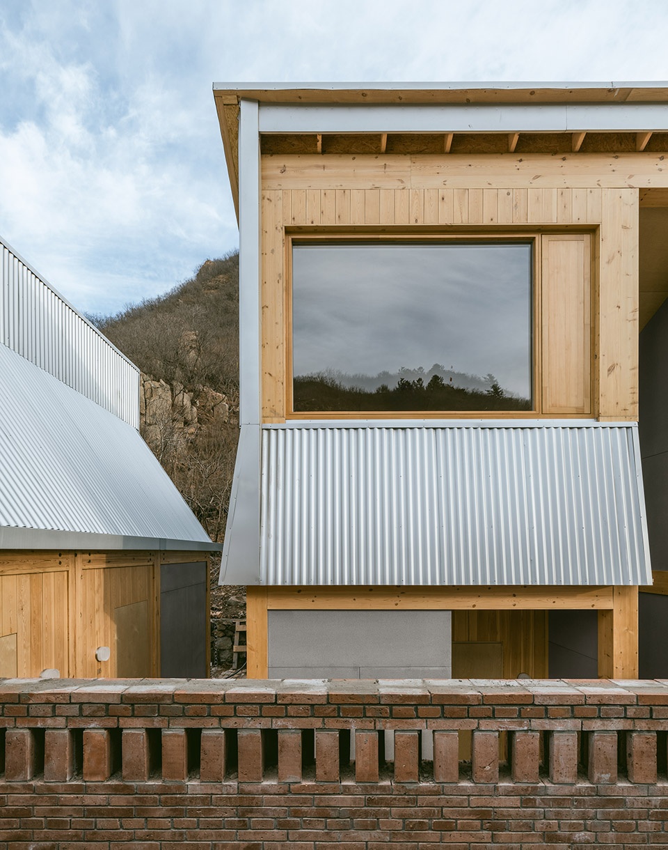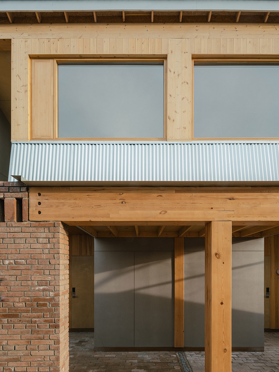 The wooden shear walls were designed to showcase the logic of “envelopment,” endowing the building with a corresponding sense of weight. The upper roofing was refashioned with corrugated metal sheets, reshaping the building’s exterior. The details echo the form language of the original sheds, making this envelopment more in line with the material’s constructional context. We envisaged “Full Chestnut Terrace” as a contemporary wooden structure, with modern technological features as its underlying theme.