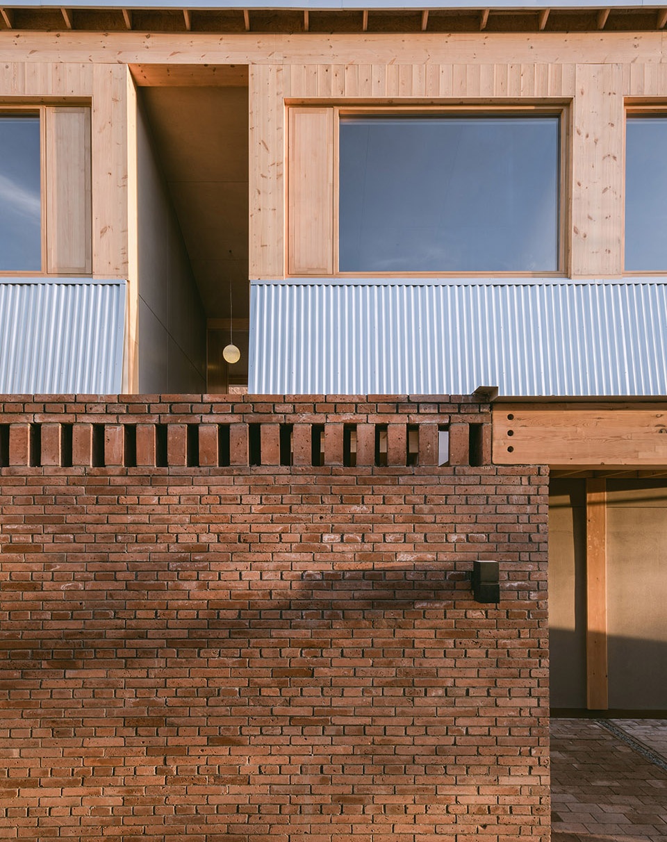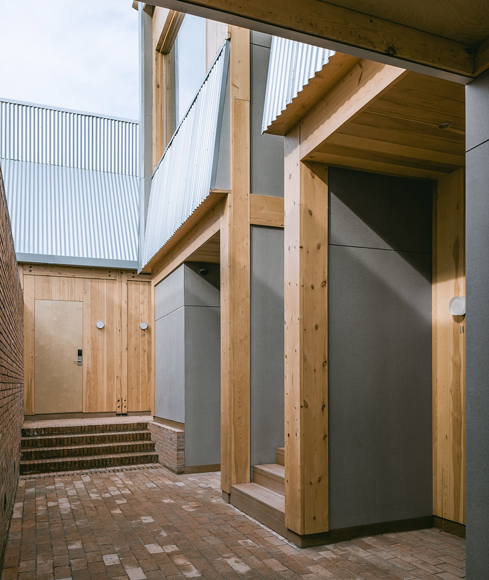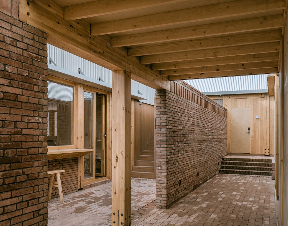 The wooden shear walls were designed to showcase the logic of “envelopment,” endowing the building with a corresponding sense of weight. The upper roofing was refashioned with corrugated metal sheets, reshaping the building’s exterior. The details echo the form language of the original sheds, making this envelopment more in line with the material’s constructional context. We envisaged “Full Chestnut Terrace” as a contemporary wooden structure, with modern technological features as its underlying theme.