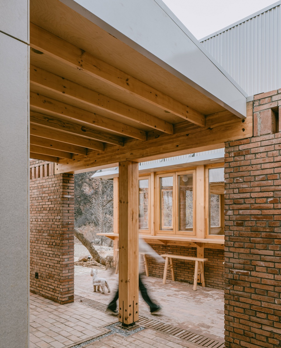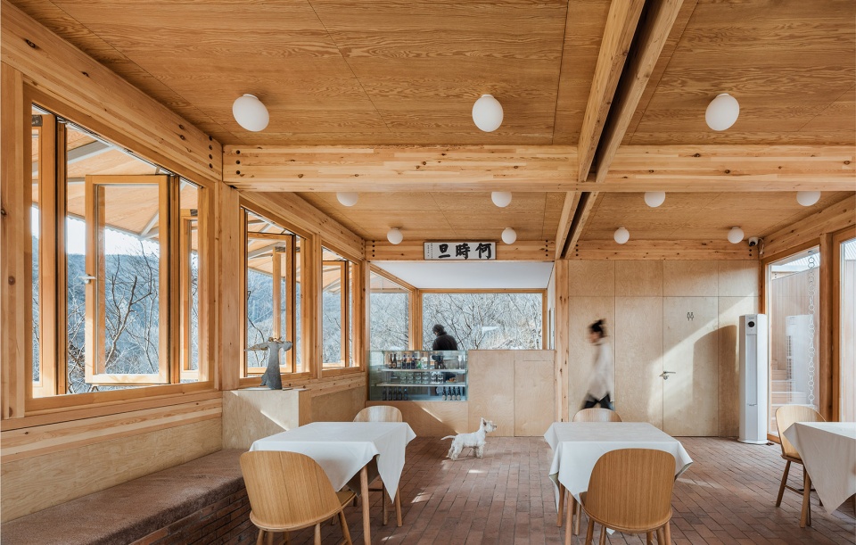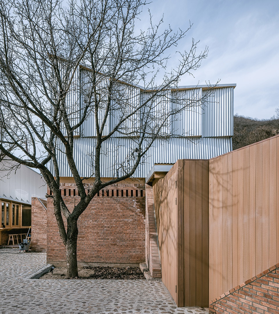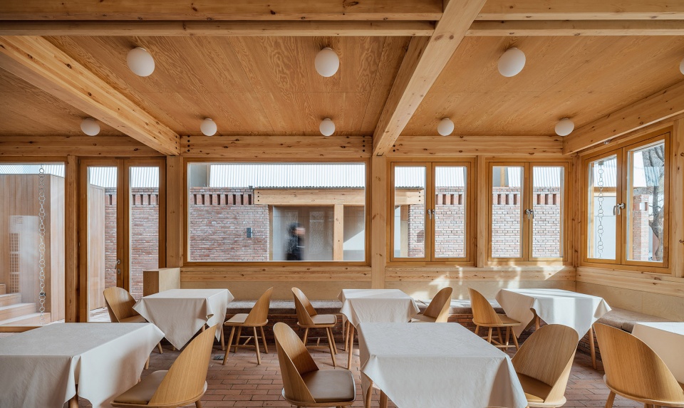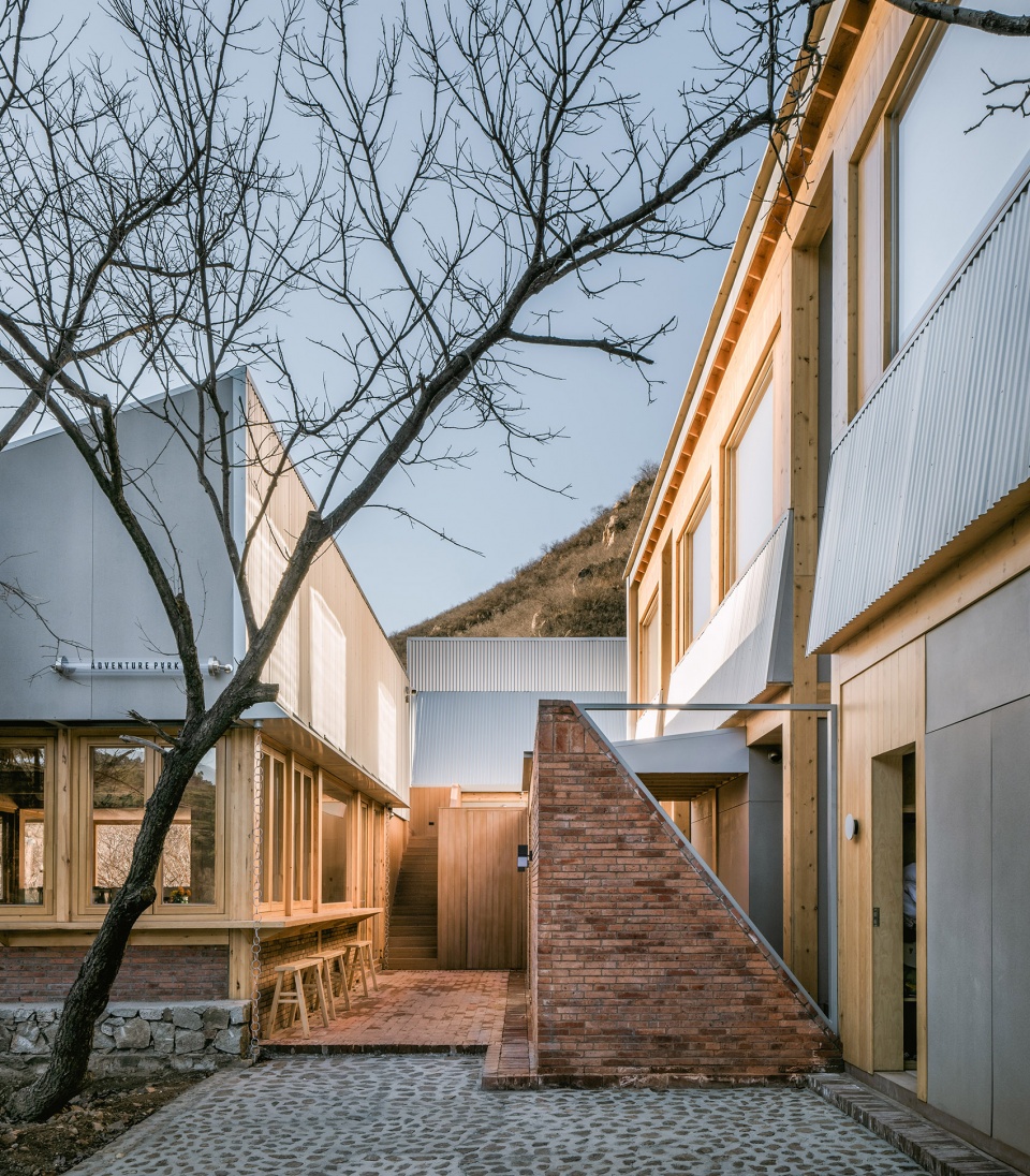 When the site was still occupied by sheds, workers would pick up yellow stones from old piles to construct threshold walls and foundations for houses. During the reconstruction, we used old red bricks salvaged from nearby villages and towns to unify the disconnected building units at the ground level. Various slanted walls redressed the building’s outline, stretching between the plateau and the woods, creating a man-made layer distinct from the wooden houses. This bestowed a certain commemorative quality, forming a “relic” of this era.