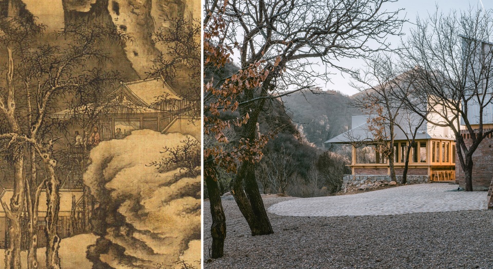 一千多年前,画家范宽默想着冬季的北方山川,画下了《雪景寒林图》。十个世纪后,燕山角落的某道溪谷的中,出现了类似的场景。与其说是有意布置,不如去感谢当初建造工棚的工匠,他们为建筑找到了最合适的构图位置。