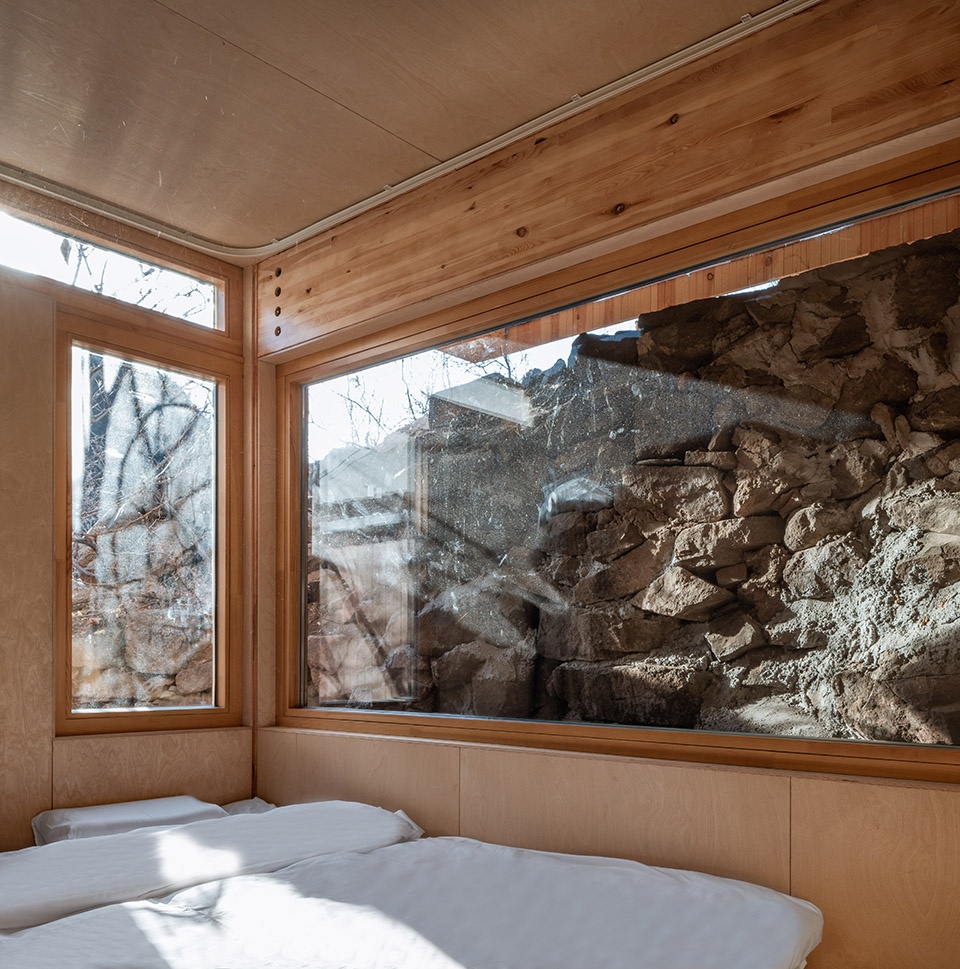 当这里还是工棚时,工人们会从老石堆上捡拾一些黄石去砌筑下槛墙和房子的勒脚。改建过程中,我们用周边村镇拆卸下来的旧红砖,将互不相连的建筑单体,在一层整合起来。各类斜墙重新妆点了建筑的轮廓,盘桓在台地和林木之间,形成了一个与木屋异质的人工层次,让它们获得了某种纪念性,形成了属于这个时代的“遗迹”。