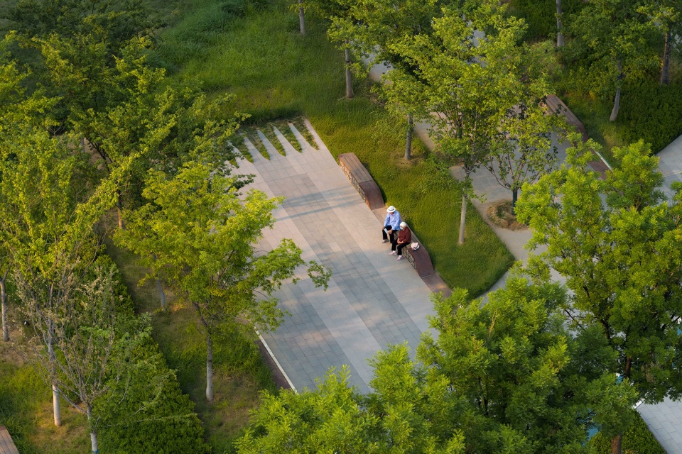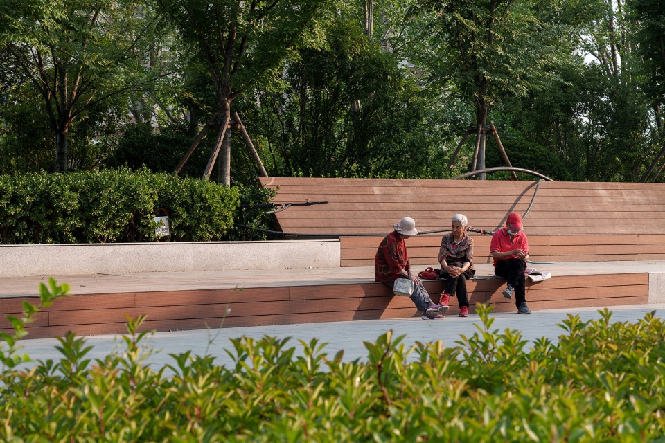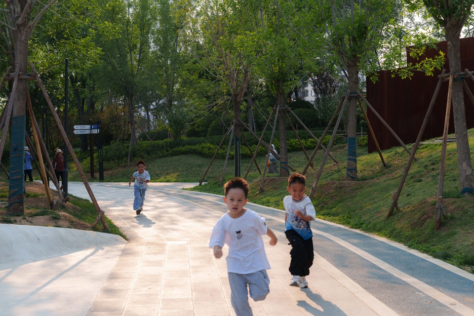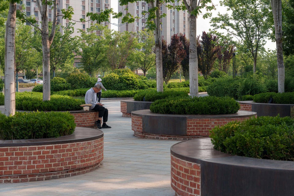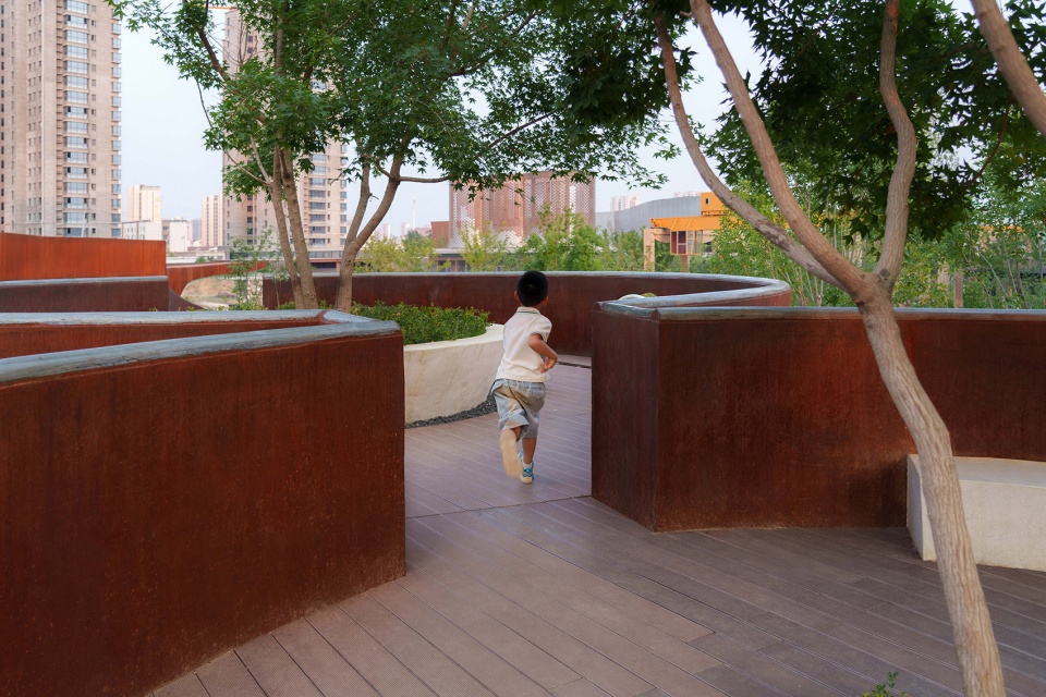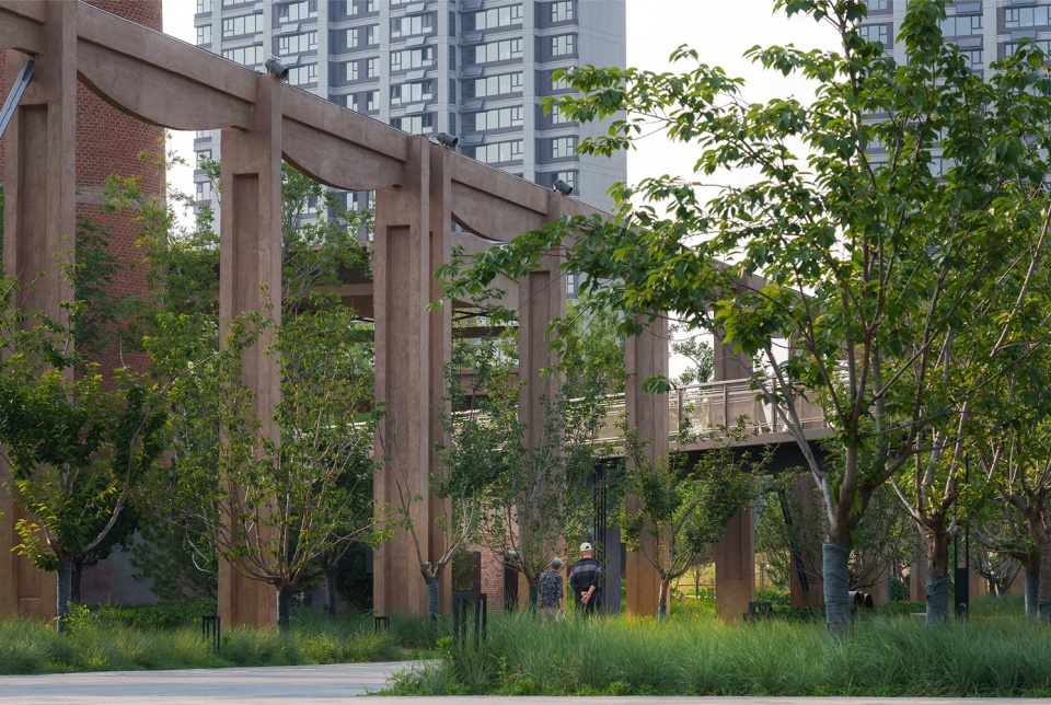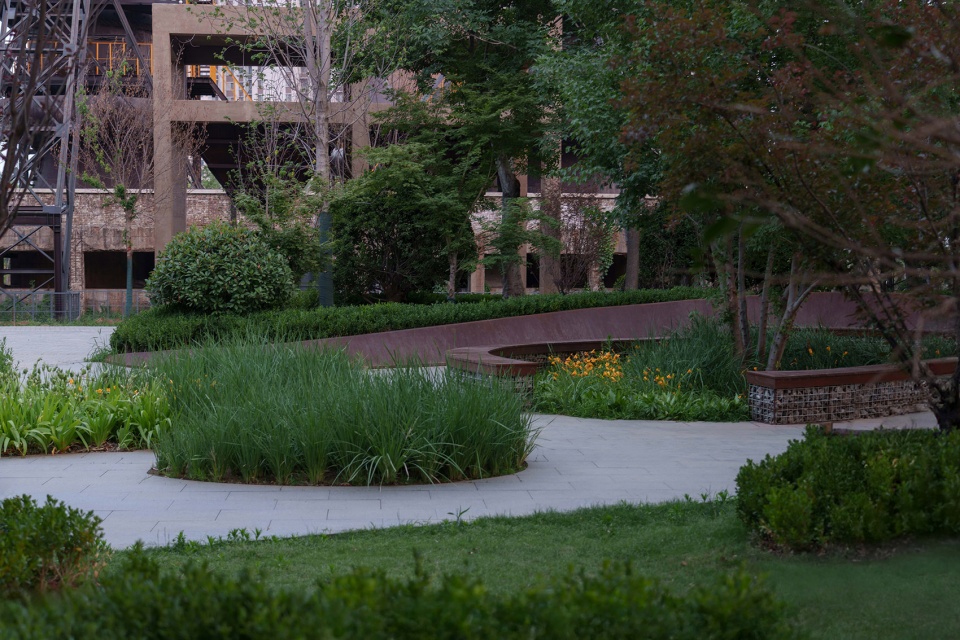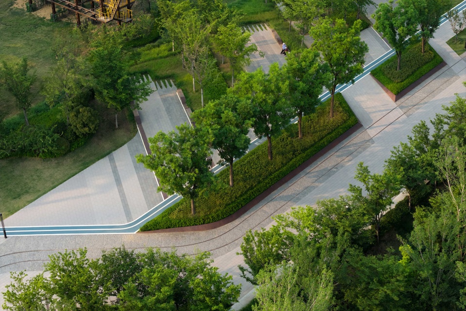 相对的,遗址区北侧临近次级城市道路,作为服务周边居民的重要绿色公共空间,设计上采用了相对流动生动的曲线造型,结合充沛的绿量,形成与遗迹核心区己截然不同的独特体验。场地通过绿化平台的手法层层铺开,消化场地固有高差的同时,设置了多处尺度宜人,空间舒适的景观空间。附近居民及游客可以透过绿意中远观工业遗迹的风貌,也可聚焦眼前实现各种社交活动,各得其所有互不干扰。
