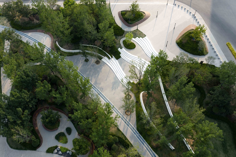 Conversely, the northern side of the site, facing the secondary urban road is positioned as a vital green public space for the surrounding residents. The is area incorporates relatively fluid and dynamic curves design language, combined with abundant greenery, created a distinct experience that different from the core area of the site. Layered through the site’s inherent height differences, the green platform provides a variety of pleasantly scaled and comfortable landscape spaces. Residents and visitors can admire the industrial heritage from afar through the greenery, while also focusing on the immediate surroundings for various social activities, ensuring everyone’s own perspective without interfering with others.