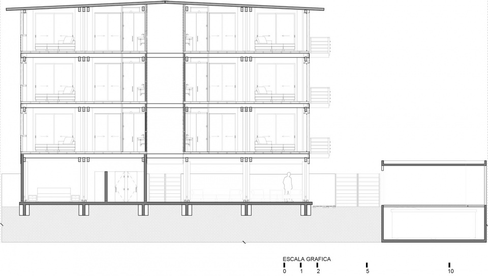 Constructed with solid treated pine and featuring walls and slabs made of fiber cement panels with a polyurethane core, the building showcases innovative material choices that ensure durability, thermal efficiency, and acoustic comfort. The cross-shaped layout eliminates shared walls between suites, offering enhanced privacy and ventilation while optimizing space.
