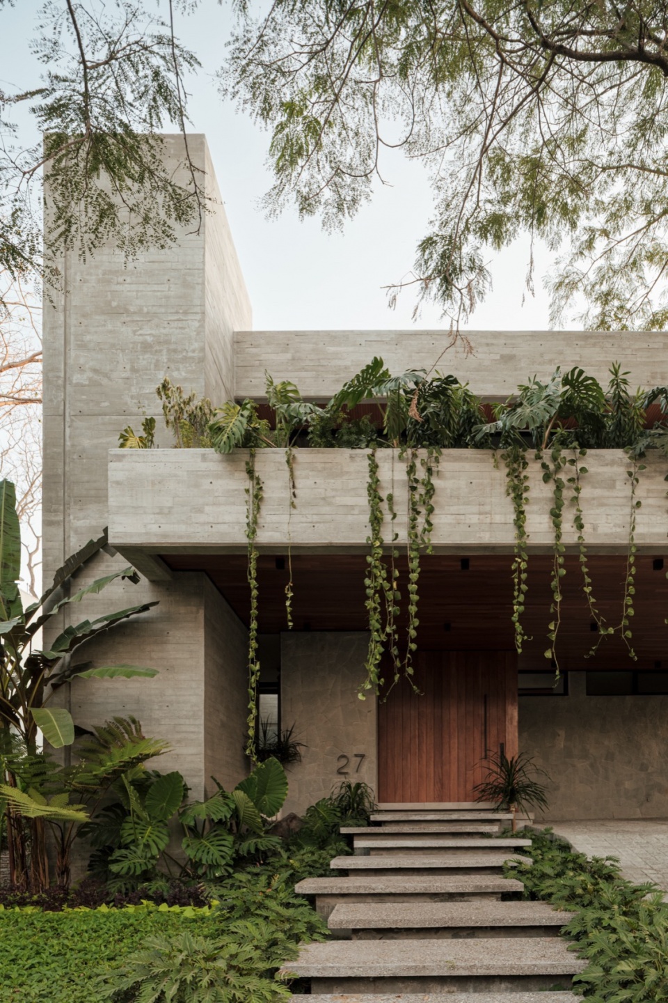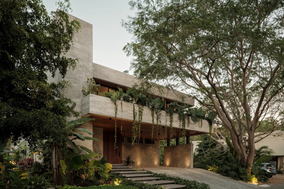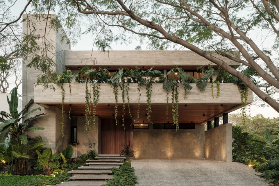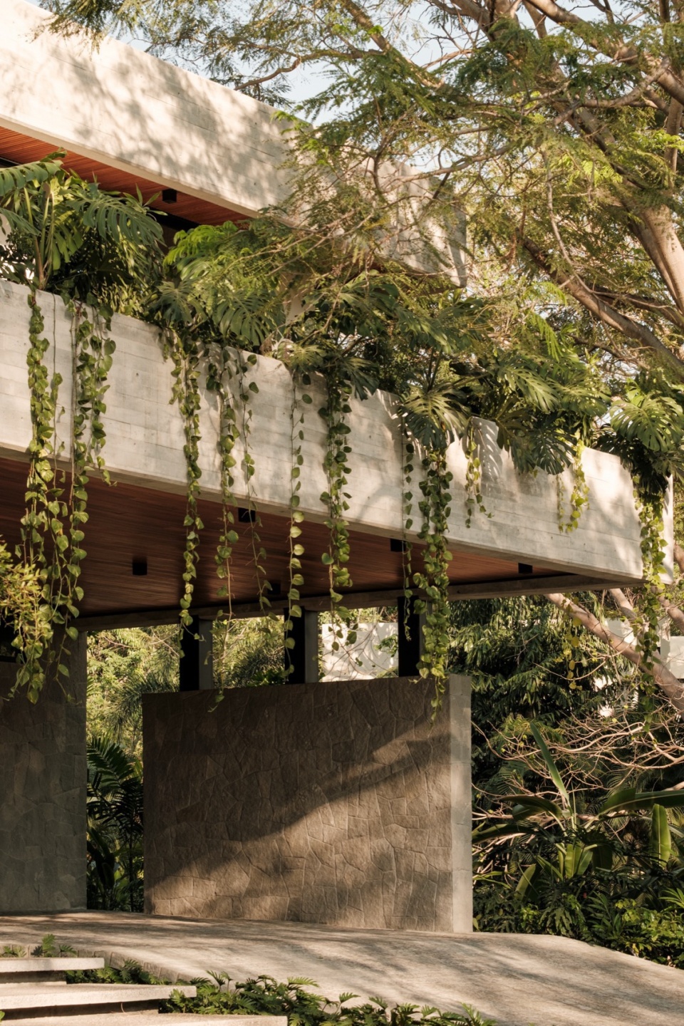 Casa Amankay reveals itself slowly. A stone staircase rises through dense vegetation, setting the rhythm of arrival. The surroundings invite a slower pace. To the right, a tall, leafy tree commands attention; on the opposite side, a vertical volume seems to respond, holding a quiet balance. The architecture presents itself clearly, but finds in the shadows and the greenery a gentler way of appearing.