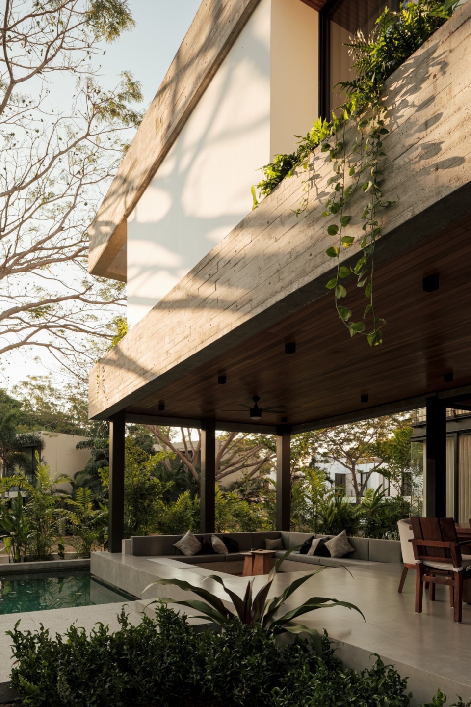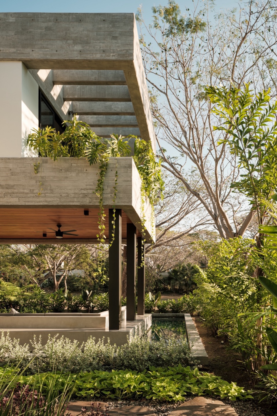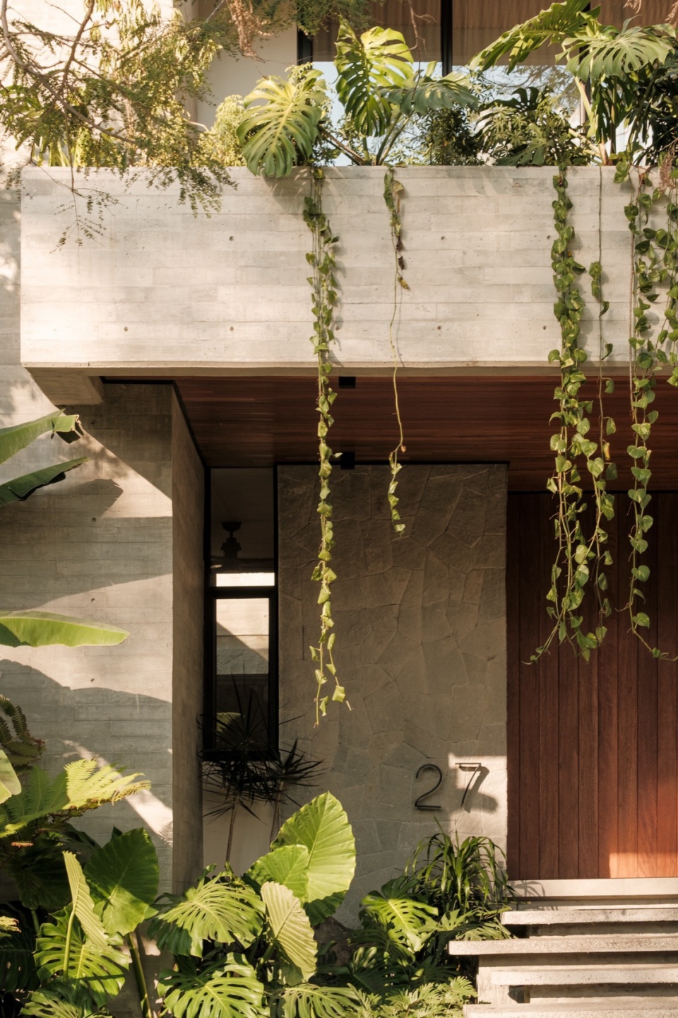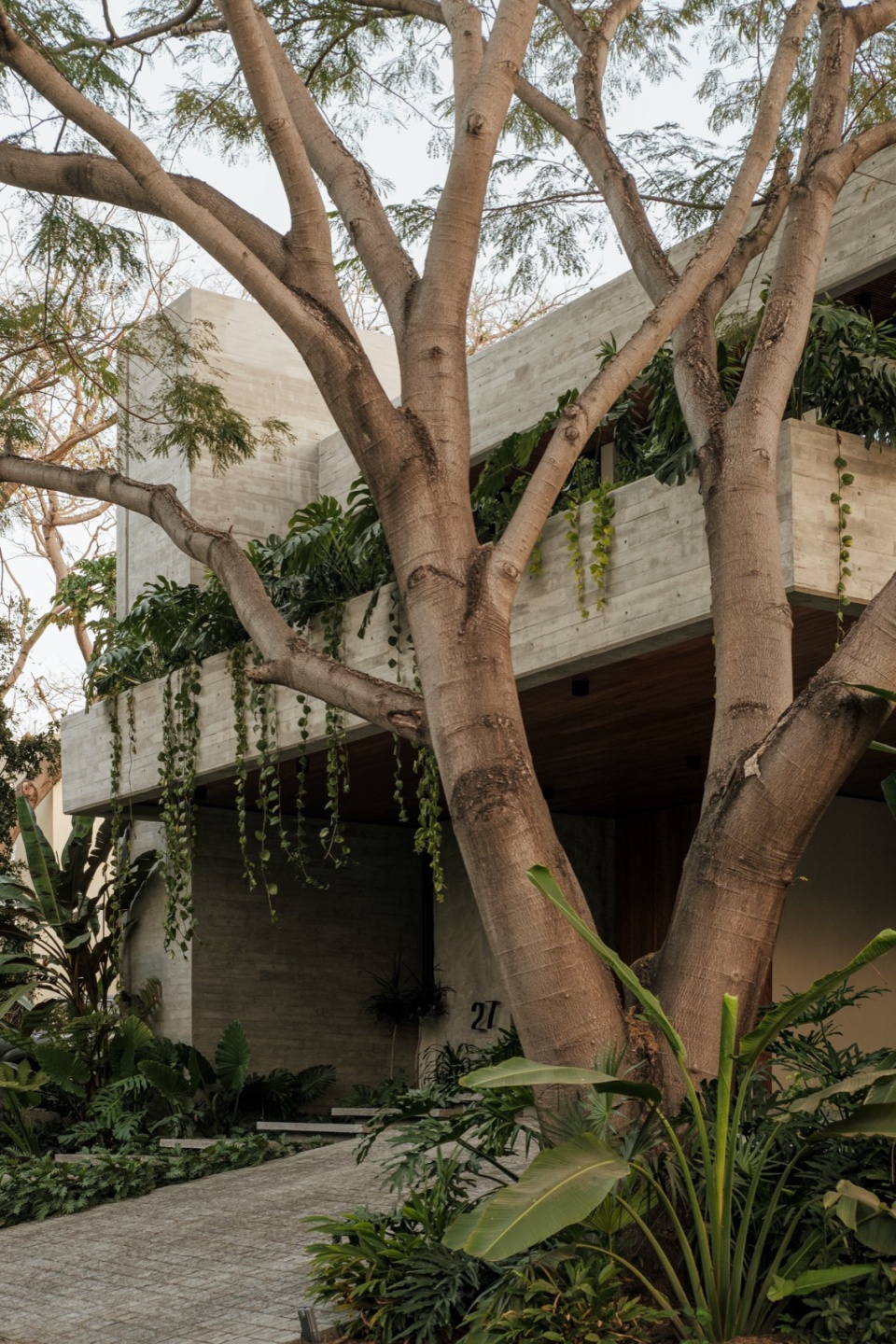 Casa Amankay reveals itself slowly. A stone staircase rises through dense vegetation, setting the rhythm of arrival. The surroundings invite a slower pace. To the right, a tall, leafy tree commands attention; on the opposite side, a vertical volume seems to respond, holding a quiet balance. The architecture presents itself clearly, but finds in the shadows and the greenery a gentler way of appearing.