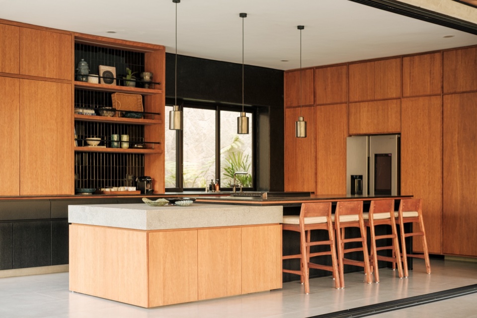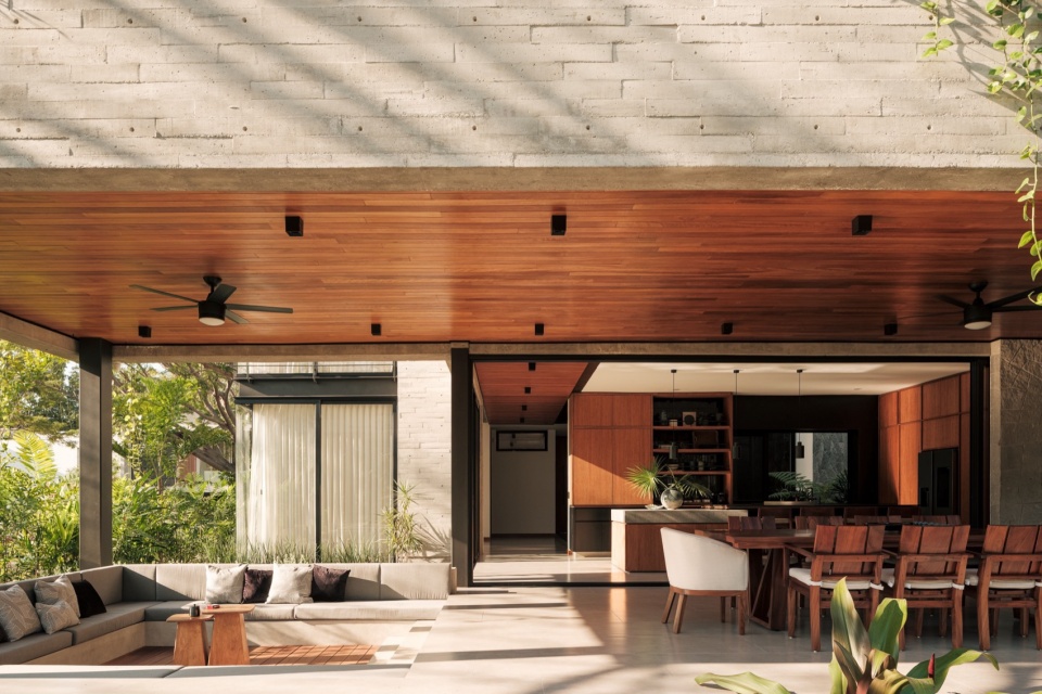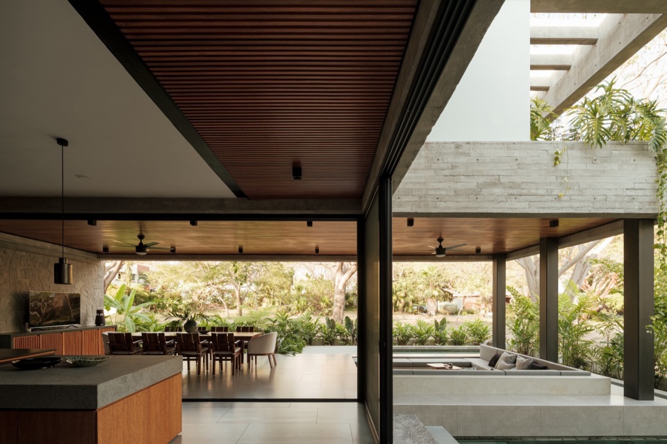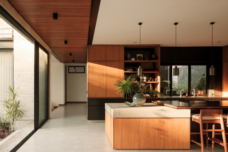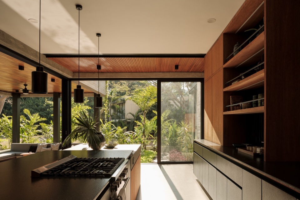整体材料组合强化了住宅的内敛特质:板模混凝土、石材和钢材定义了结构与氛围,而木材——用于门、天花板和家具——增加了温暖感,却不破坏整体基调。一切都保持在中性、单色的范围内,从而凸显不断变化的元素:植被、光线和穿过庭院流动的空气。