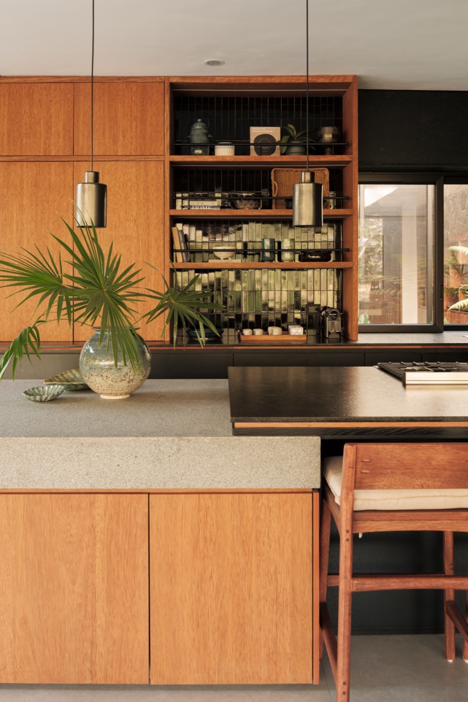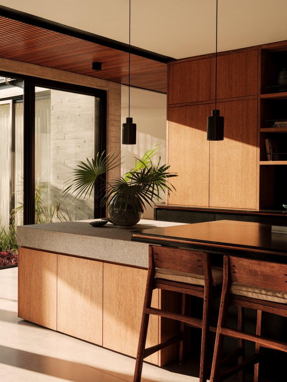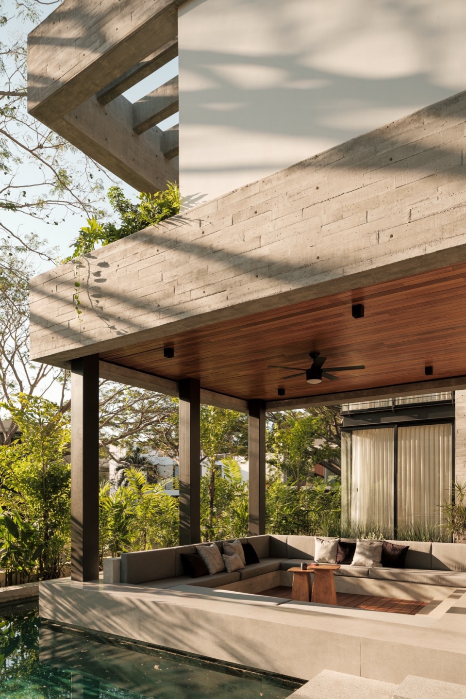 整体材料组合强化了住宅的内敛特质:板模混凝土、石材和钢材定义了结构与氛围,而木材——用于门、天花板和家具——增加了温暖感,却不破坏整体基调。一切都保持在中性、单色的范围内,从而凸显不断变化的元素:植被、光线和穿过庭院流动的空气。