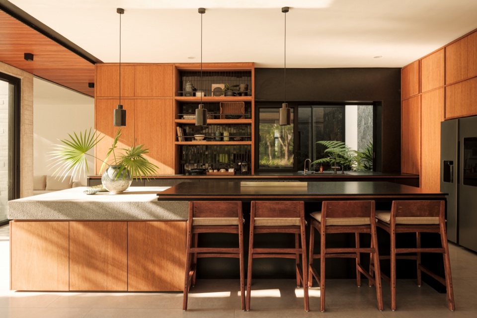 Toward the back, a patio anchors the social spaces. The kitchen and terrace open completely to the outside, and just a few steps down are enough for the terrace to feel more intimate without becoming isolated. Everything is enclosed by vegetation: a living barrier that replaces walls, allowing one to see without being seen.