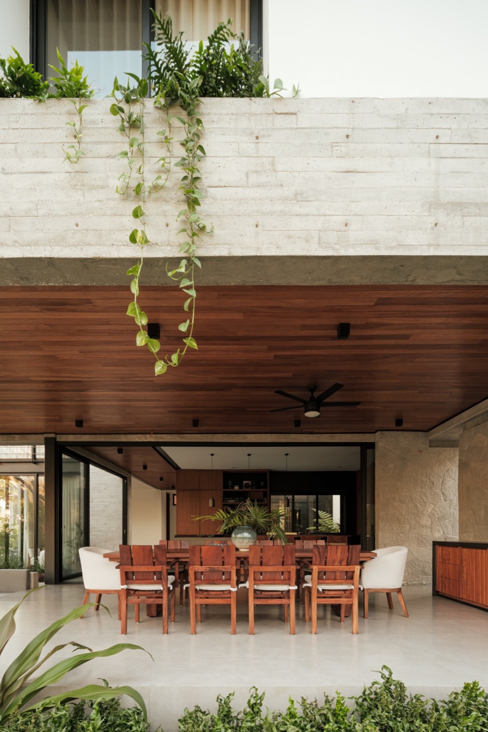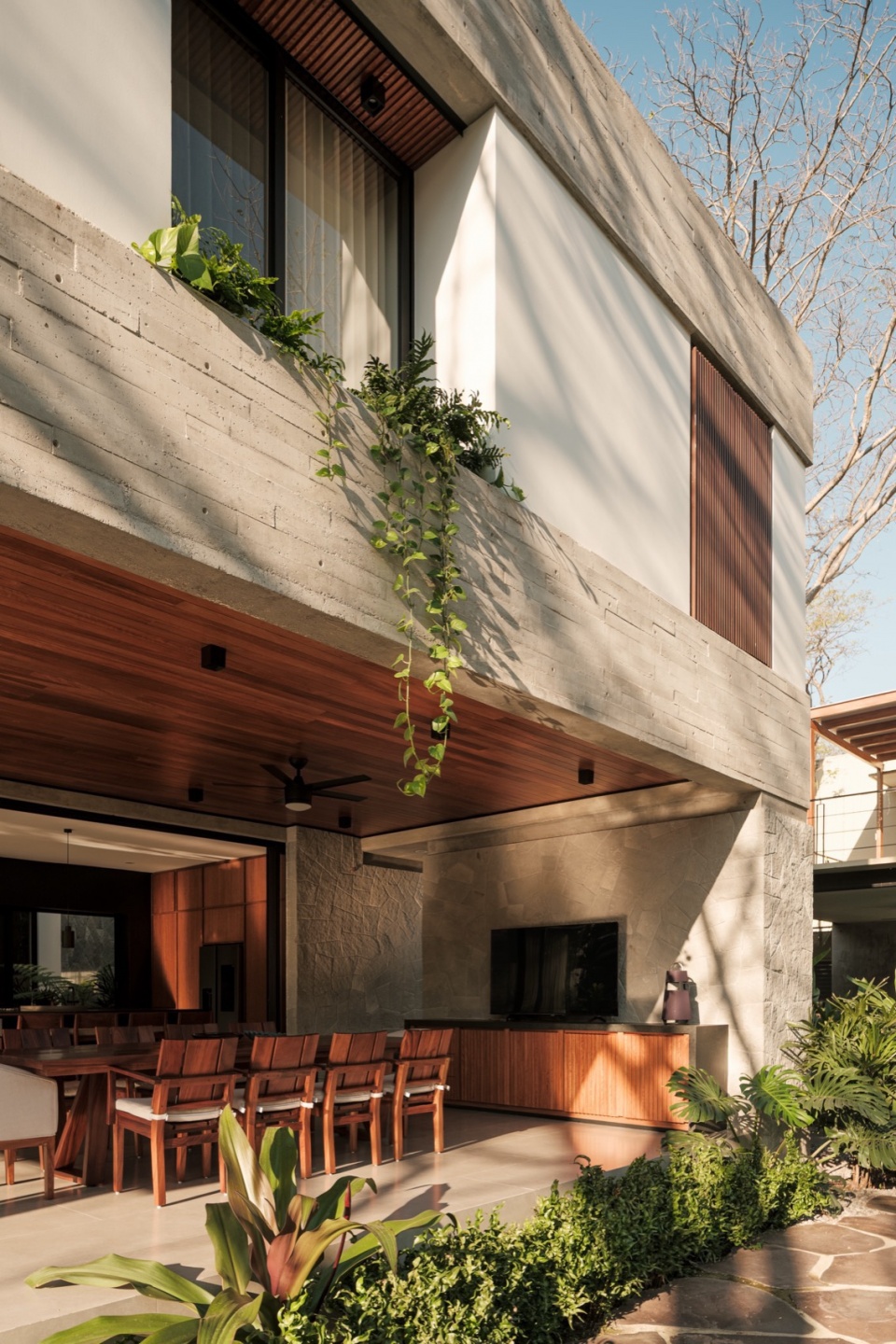 From the outside, the volume reads as a horizontal sequence. A band of exposed concrete runs along the entire façade and, together with the roof slab, frames the upper floor as if held between two planes. This line is not merely structural; it houses deep planters that follow its path, echoing the geometry with vegetation. As if the house were returning a part of the ground it occupies. The gesture is firm, but never rigid.