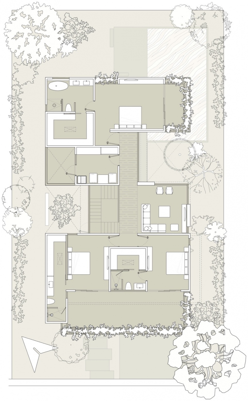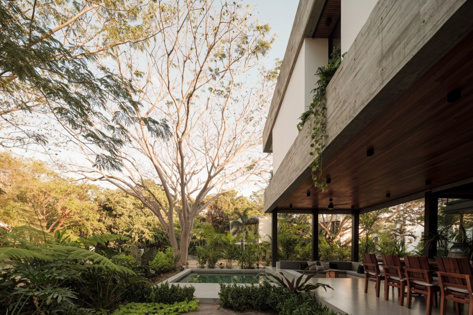 上层更为私密,布置了卧室。在这里,亲密感与绿意的持续存在并存,绿意通过每扇窗与每个露台渗入。房间直接向庭院或阳台打开,强化了与周围环境的联系。自然无处不在,房屋也未加阻拦。