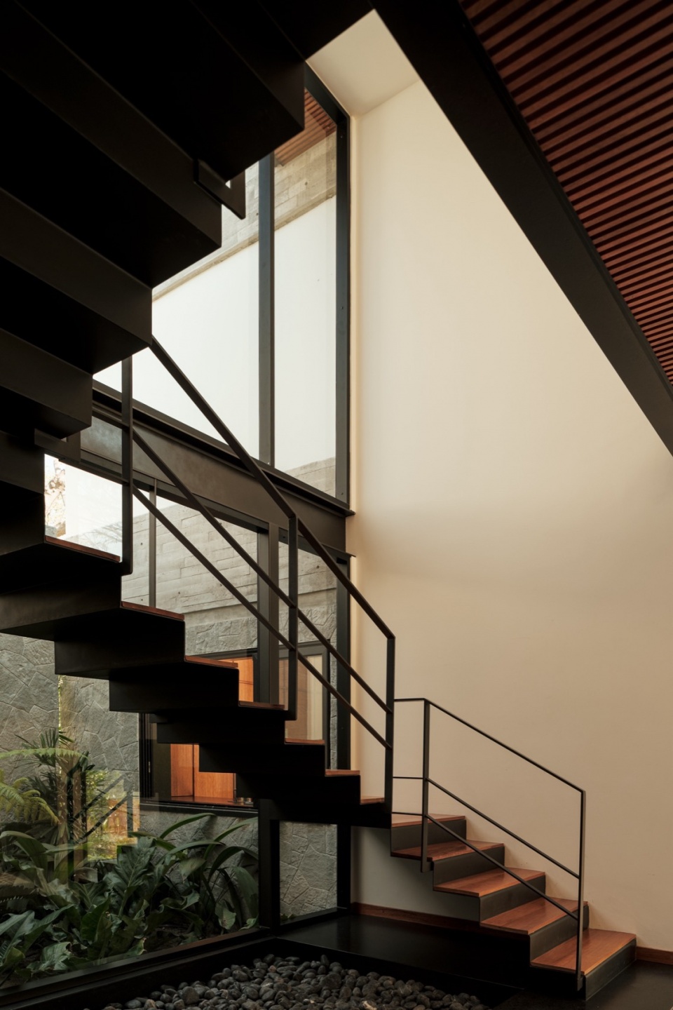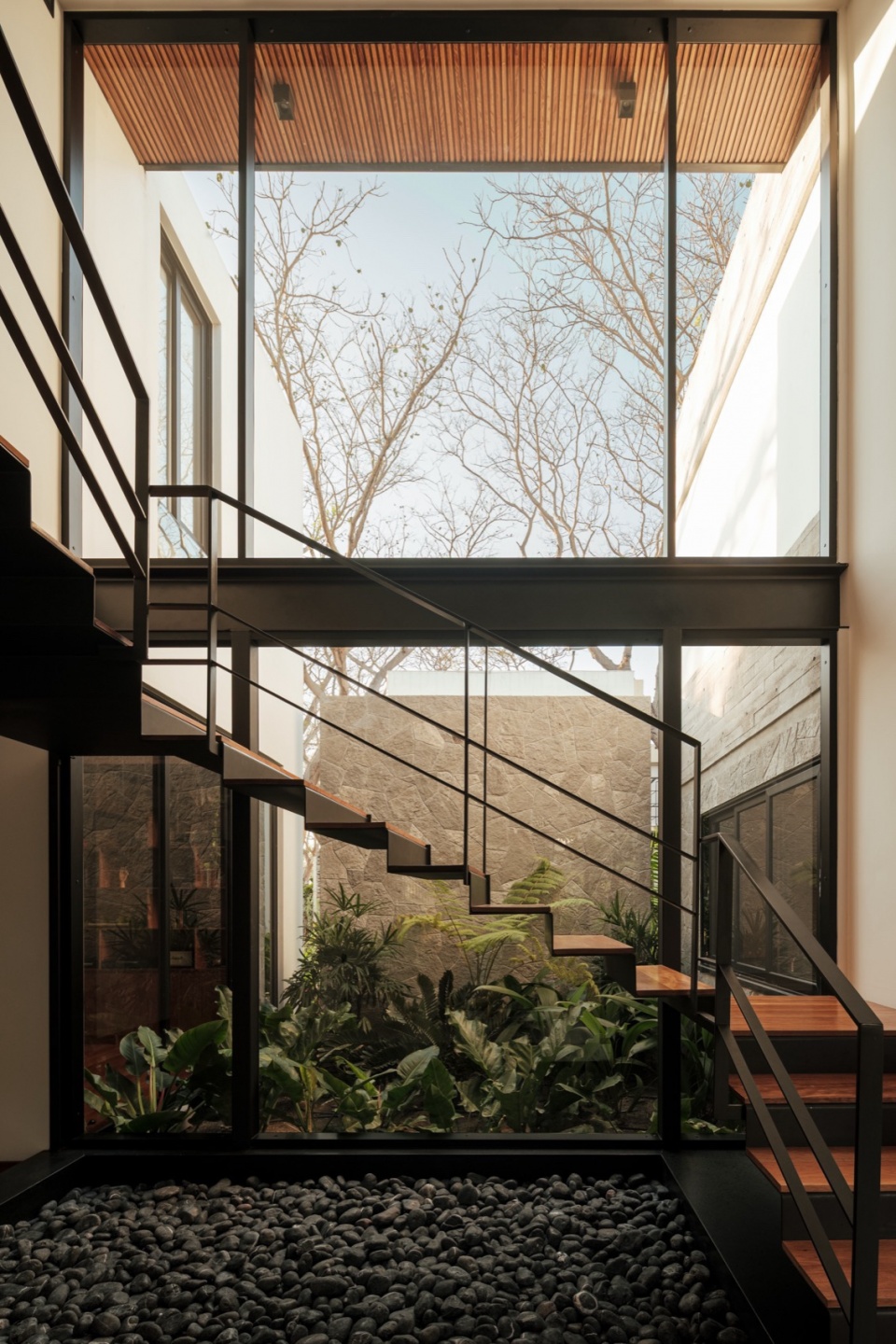 Inside, the first pause comes with the staircase. Made of steel and wood, it floats in the space with an almost sculptural presence. Beneath it, a bed of loose stone insists on pulling the outside in. A double-height window frames the foliage, and the greenery filters in, softly, through reflections. The light shifts throughout the day, casting irregular shadows, revealing the textures of the walls, and projecting the green of the leaves across grey, rugged surfaces.