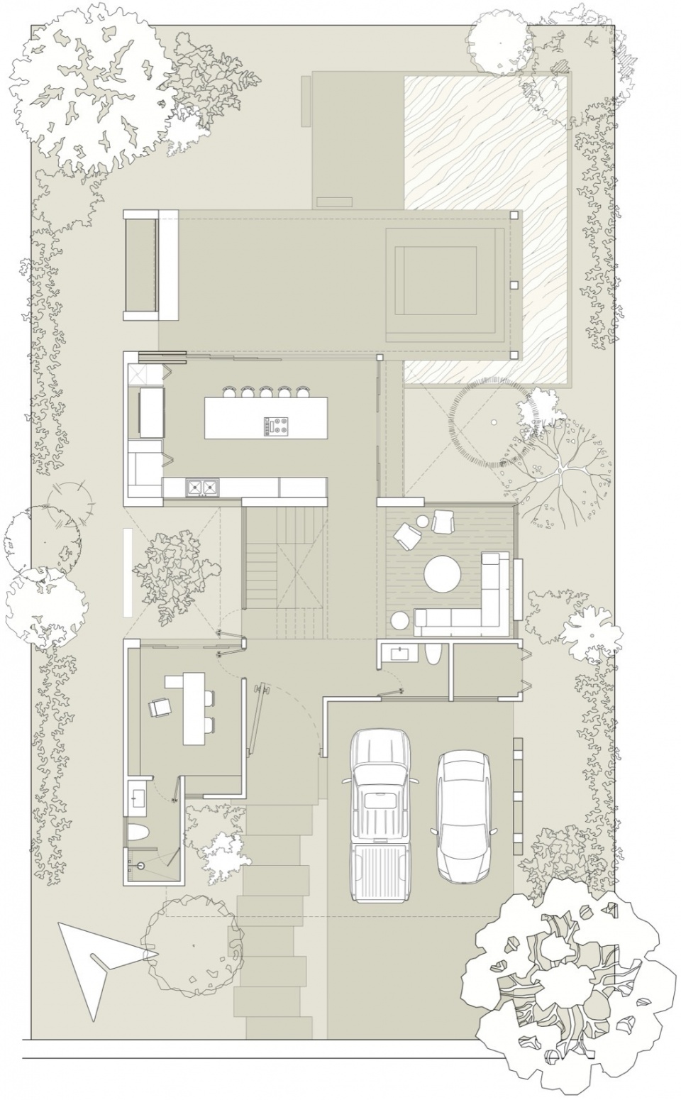向后延伸,一个庭院成为社交空间的核心。厨房与露台完全向外敞开,仅几步之差便使露台显得更为私密,却不至于隔绝。一切被植被包围:活的屏障取代了墙体,让人可以看出去,却不被看到。