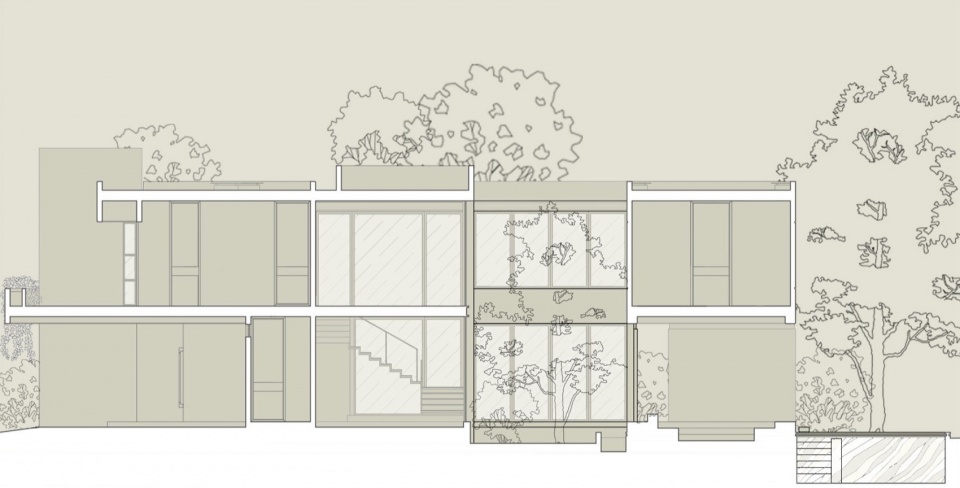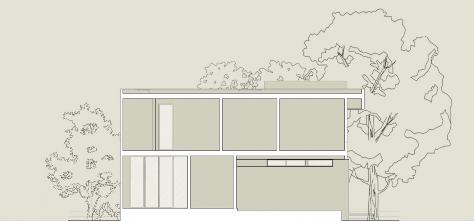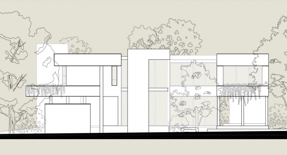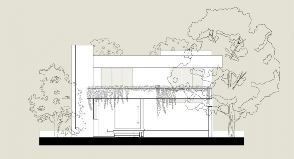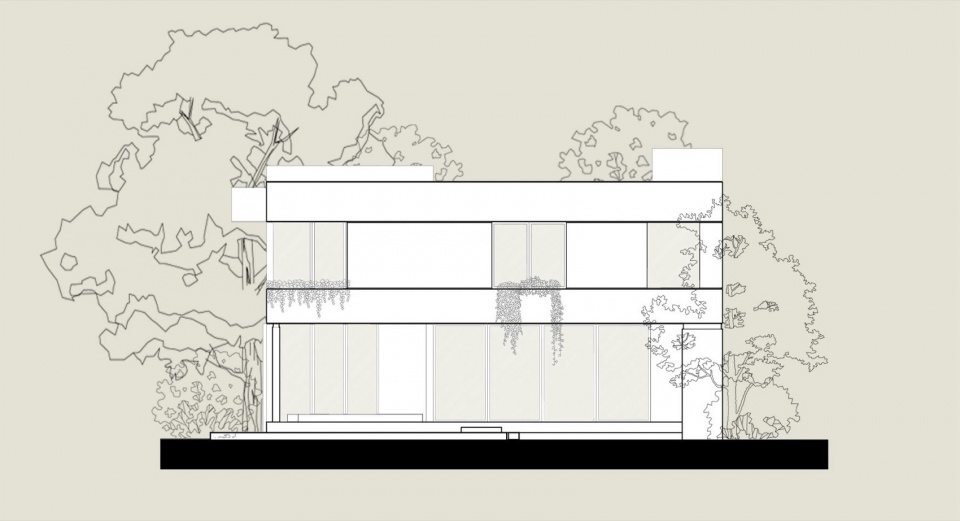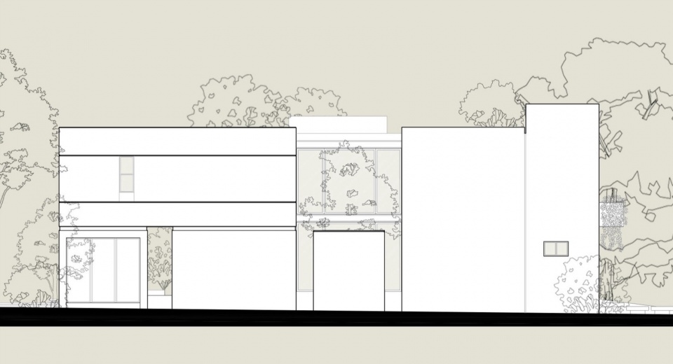 从外部看,体量呈现为水平序列。一条裸露的混凝土带沿着整个立面延伸,与屋顶板共同框定上层楼层,仿佛被两平面夹持。这个线条不仅是结构上的存在;它内置了沿线延伸的深型花坛,用植被呼应几何形态。仿佛房屋正在归还它所占据的土地的一部分。这个姿态坚定,却从不僵硬。