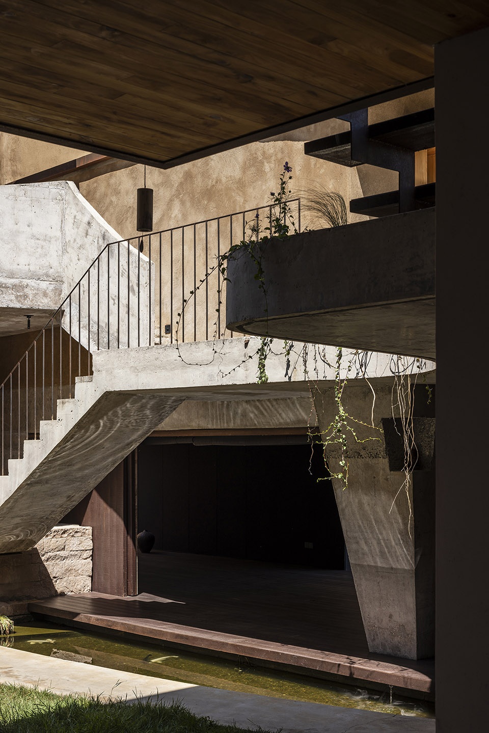 精细调整各区高差关系,使东区的视野能够尽量穿过西区望向远方。西区茶室、瑜伽室低于客厅舞台地面1.2米,层高也尽量压低,使二层眺望平台的所有邻近区域,经过几步台阶即可到达,直望坝子群山山口。