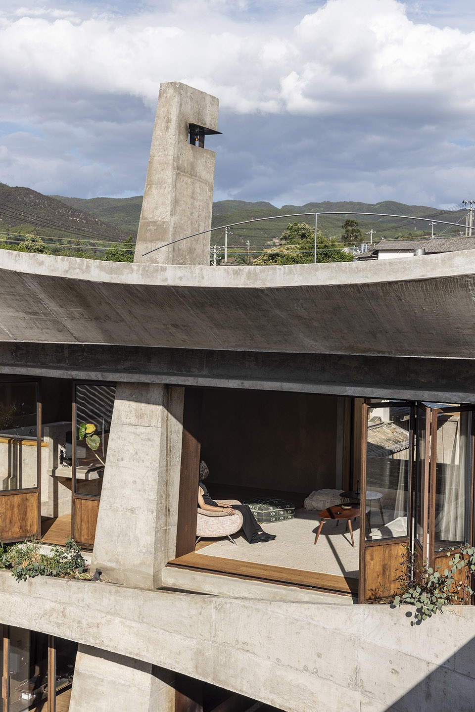 Shaxi’s autumn and winter nights can be chilly, and fireplaces are a highly practical warmth feature in Dali. To create a campfire experience, we designed an open fireplace with three-sided views at the intersection of the sofa, audio-visual area, instrument area, and stage in the East Area’s first-floor living room, giving evening gatherings the feeling of camping. Furthermore, the concrete structural columns extend directly through the roof, piercing the sky, directly communicating with the clouds and Huacong Mountain, creating a monument that stands in harmony with nature.