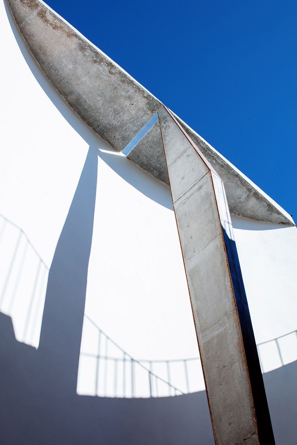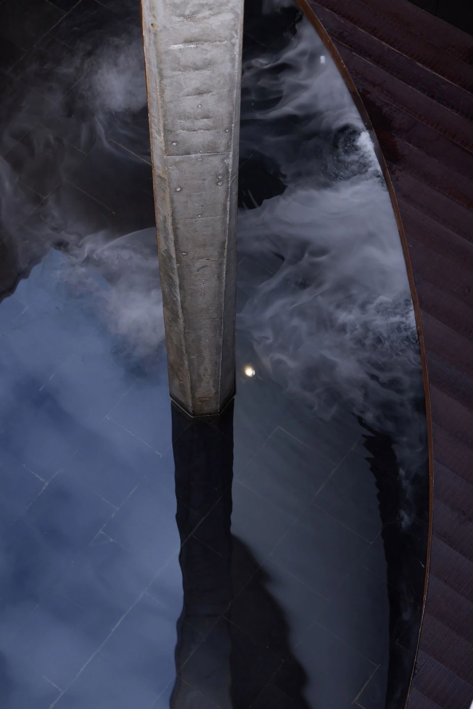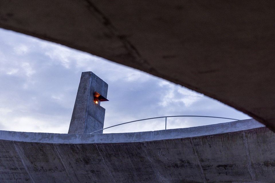 在西侧女儿墙曲面的最低处、面朝落日的方向,有一组轻盈的不锈钢线性装置,显现太阳的最后一抹高光以朝魁阁。烟囱口的长明灯、“船板”上的烟棕色碎石,诸如此类的细节,一起迎接着或壮烈或隐秘的云彩、烟霞、日出和日落。