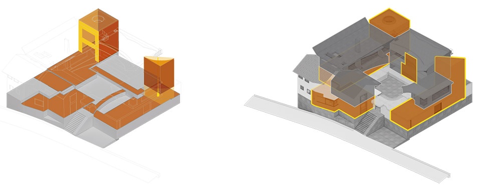 面朝黑惠江的是正房,即地势最高的东区。楼上的主人套房及屋顶露台,正对着东南村的魁阁,楼下客厅(即兴音乐区)向院子延伸出舞台,所有的钢框落地门窗都可以平移或折叠打开,没有地轨,室内外边界更加模糊,支持畅快活动。