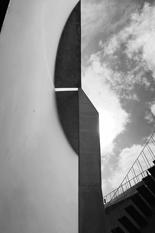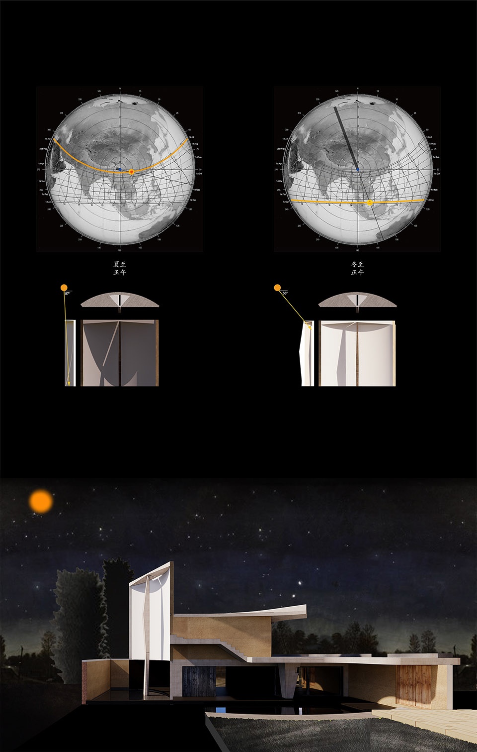 我们想把上空的存在,包括太阳和月亮,通过日晷塔强烈地显影出来。沙溪接近北回归线,夏季较高的太阳会将小屋面的影子落在弧形墙上,于是屋面的缝隙形成“光针”;冬季太阳高度角低,垂直于地面的柱体在墙上投下更多“影针”。无论是云的阴影变换,还是雨的流落,对室内来说都是精彩的剧目。夜晚,它又成为月晷塔。显影与剧目,光针与影针的刻度,都不息不止。