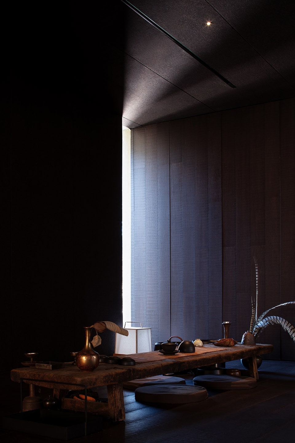 The sundial tower connects to an equally sensitive everyday. The ceiling height of the yoga and tea rooms is lowered to 2.25 meters, allowing the body to maximize its ability to sit, touch, and wander. The space receives light simultaneously from multiple openings, mostly absorbed by the dark brown fabric wall coverings and ceiling, while also slightly reflected from the cross-sawn texture of the brown-black bamboo flooring. The body and consciousness are acute, gazing out from the shadows at the infinitely distant highlights, encouraging concentration or reverie. The spotlight above the tea table is a mere one watt, much like camping in the wilderness, watching Xiaobai paddling alone on a paddleboard across the vast expanse of the lake.